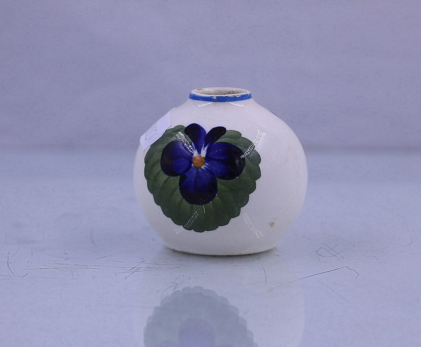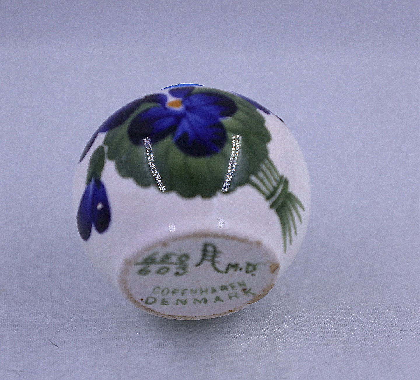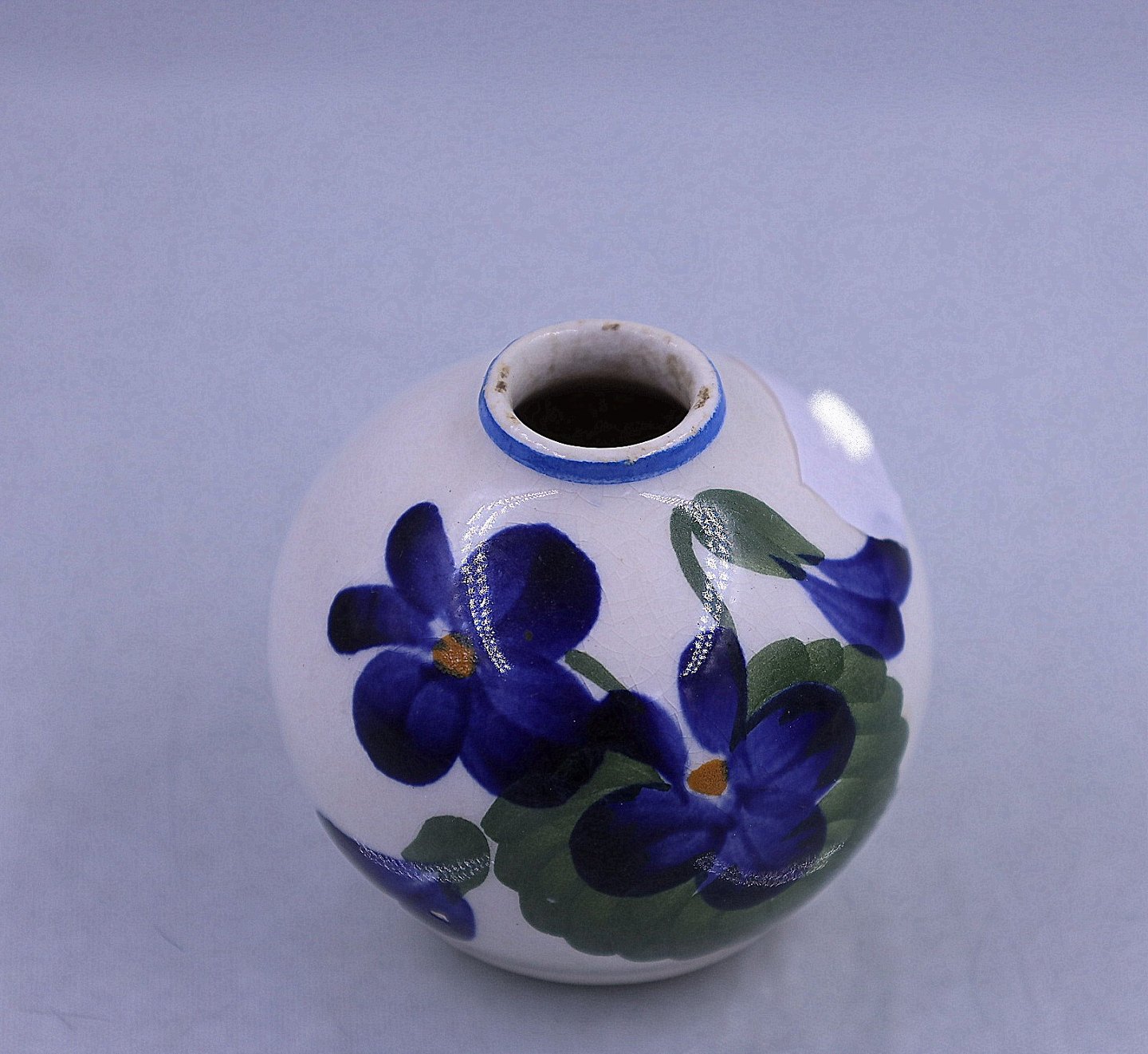 Aluminia blomsterholder, nr. 650/603. Vasen er dekoreret med blå blomster og grønne blade