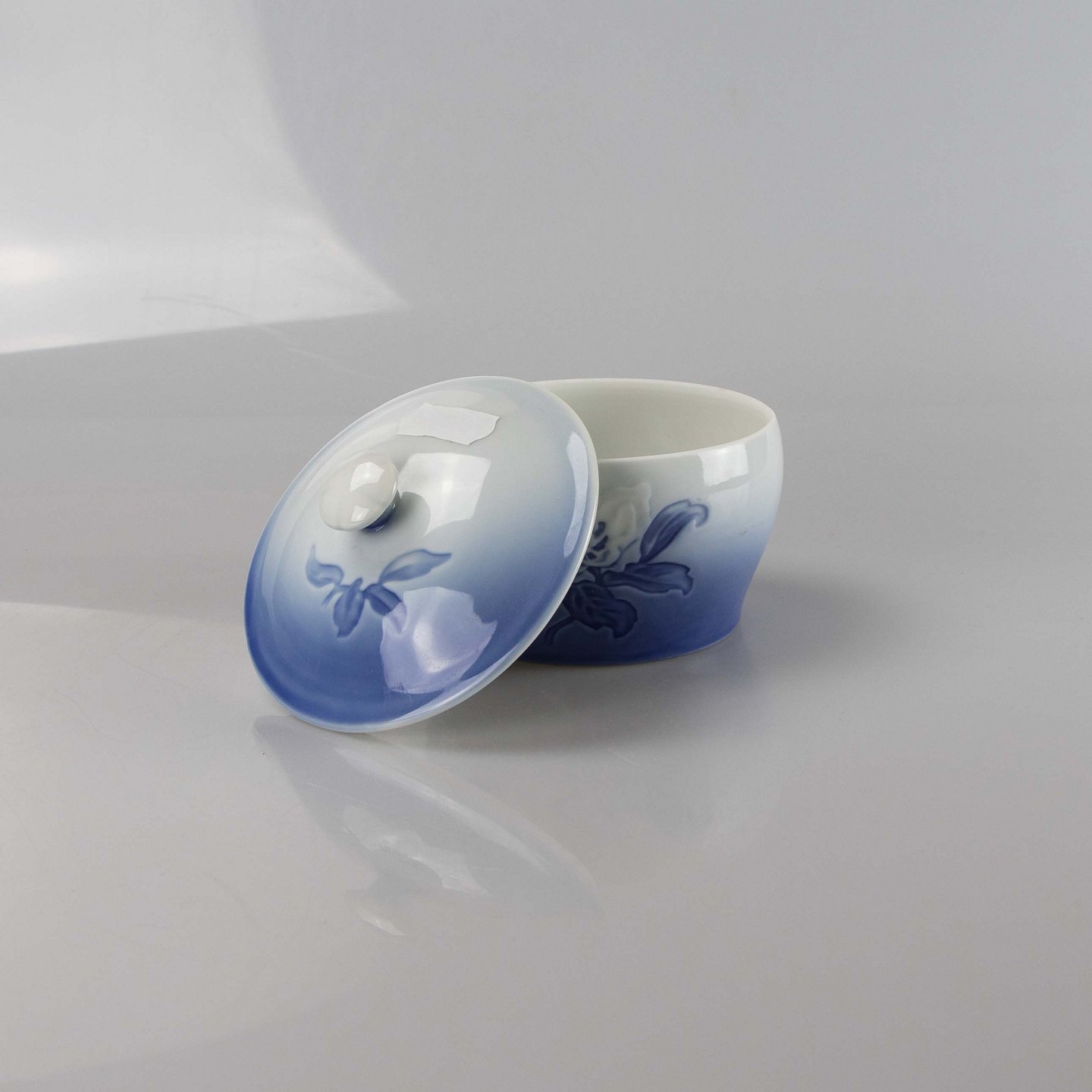 Lågkrukke i hvidt og gradueret blå porcelæn med motiv af julerose.