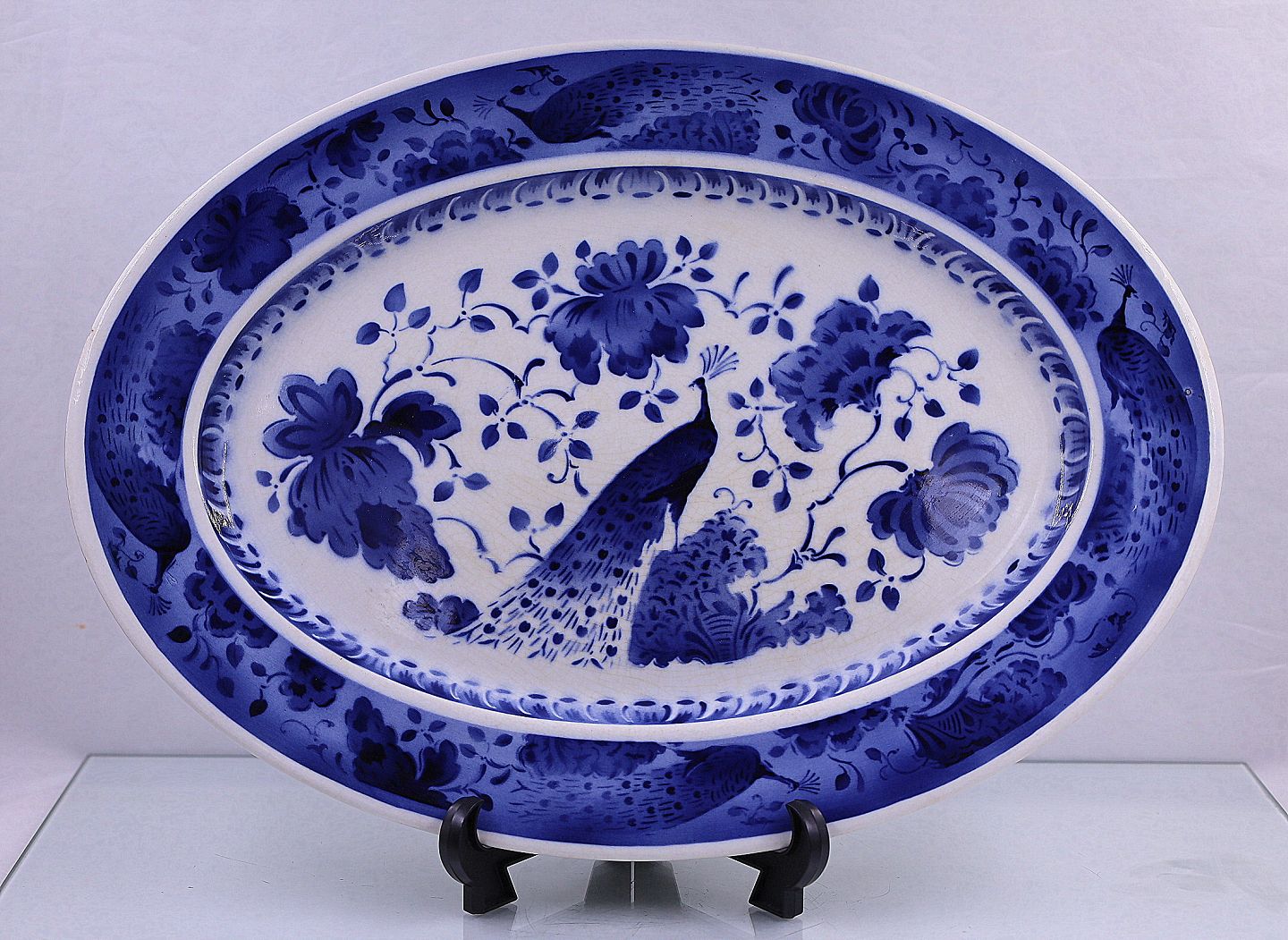Københavns Fajancefabrik/Aluminia 1923-1940. Ovalt serveringsfad fra Påfuglestellet. Fadet er af fajance. Dekorationen er af Oskar Willerup. Der er ingen brugsspor på serveringsfadet