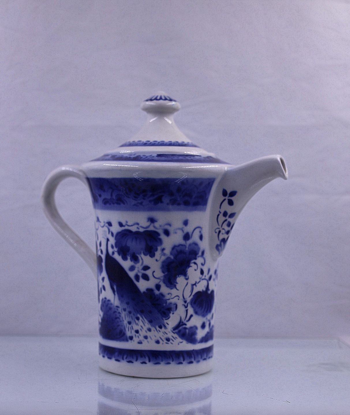 Aluminia .Kaffekande med låg fra Påfuglestellet. Kaffekanden er af fajance. Dekorationen er af Oskar Willerup.