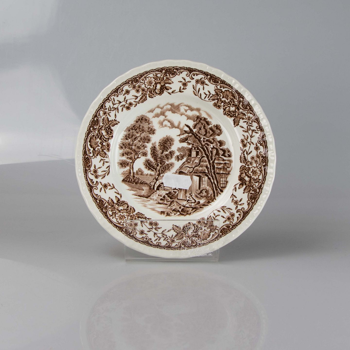 Tallerken i lys fajance med brunfarvet landsbymotiv.