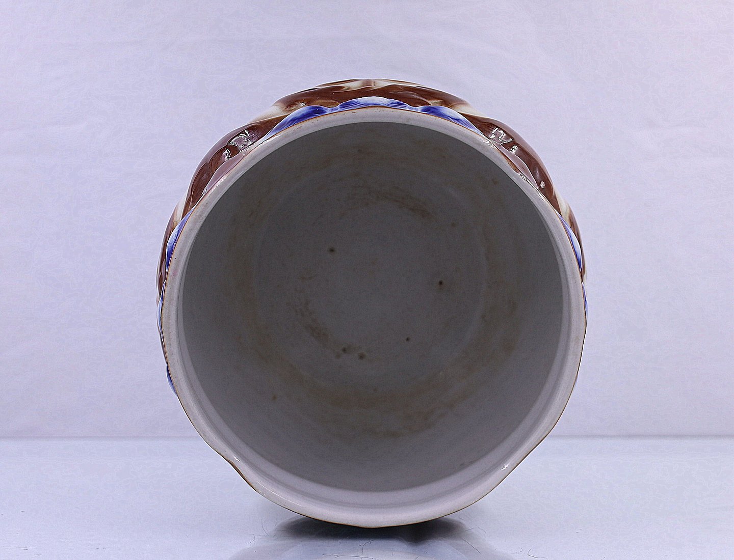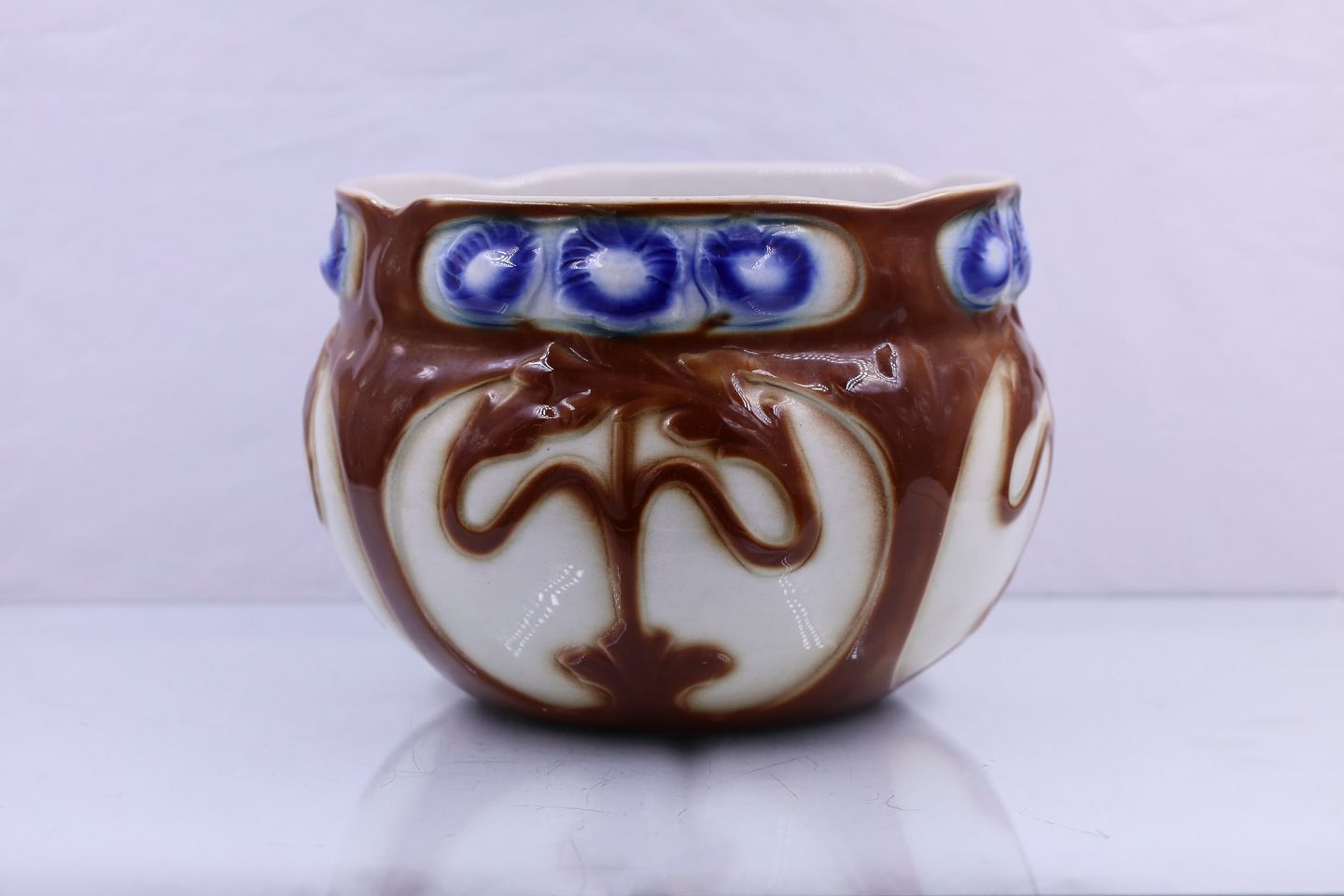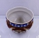 Majolica Fajance urtepotteskjuler, mede brunt stregmønster og blå blomster