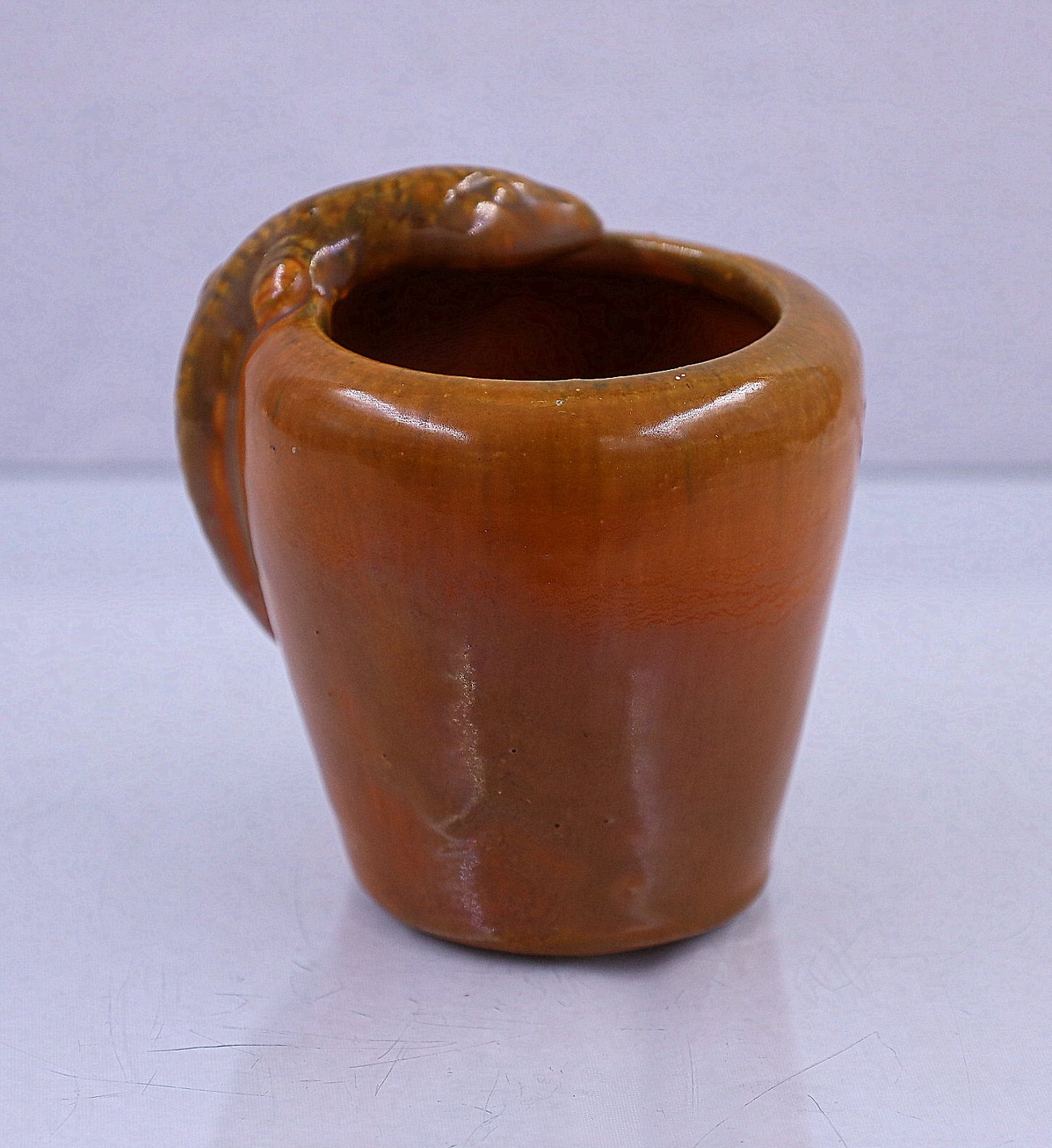 Brunlig vase mede gekko, som dekoration. Vasen er af keramik. Vasens facon er konkav. Vasens oprindelse ukendt, der er ingen skår og afslag på vasen