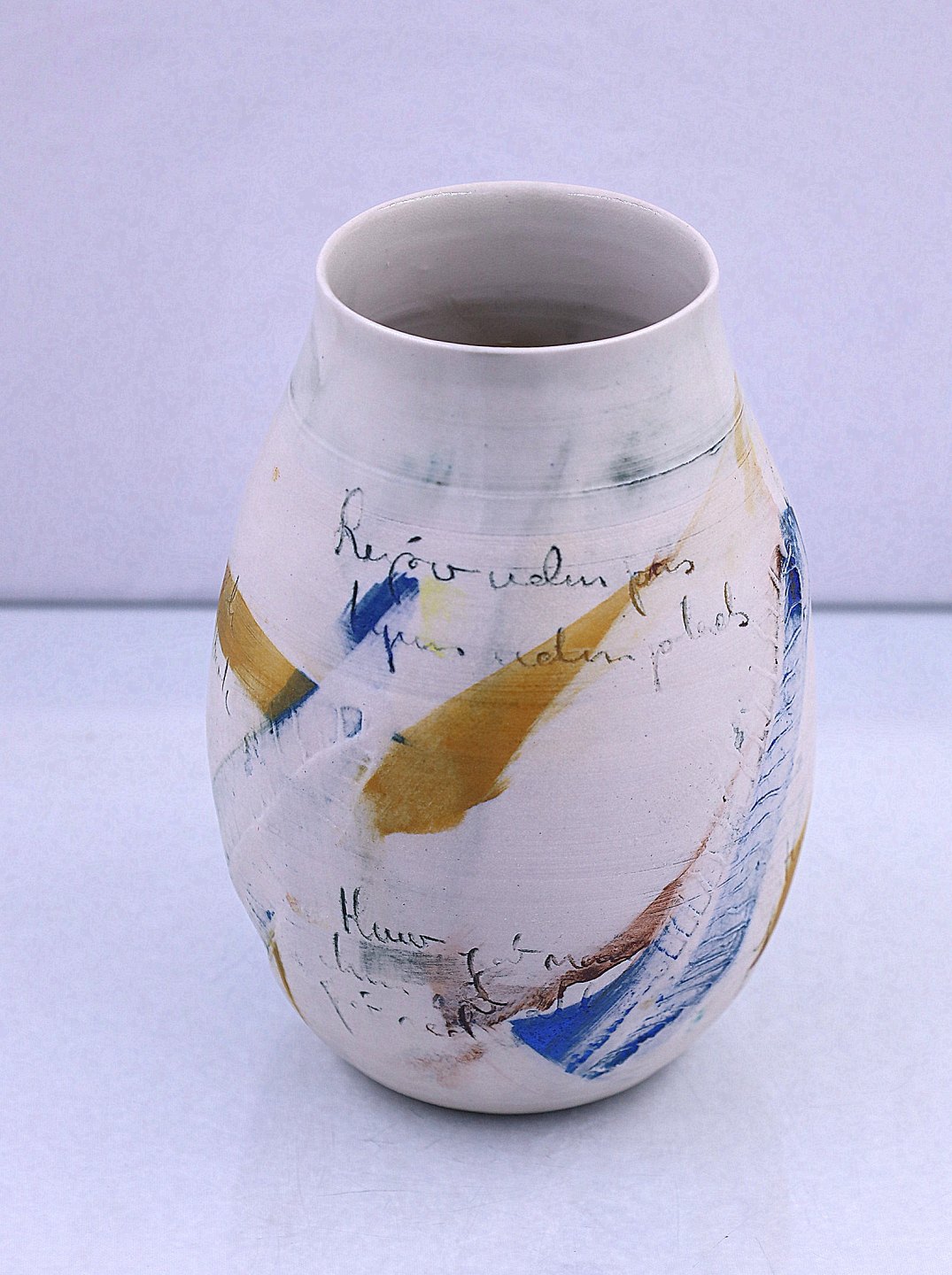 Louise Lange, Hjelmerstad, Aalborg. Vase i keramik, dekoreret med citater på forskellige sprog, samt glasur i brun og blå farver, indvendig hel glasur. Signeret Louise Lange 03