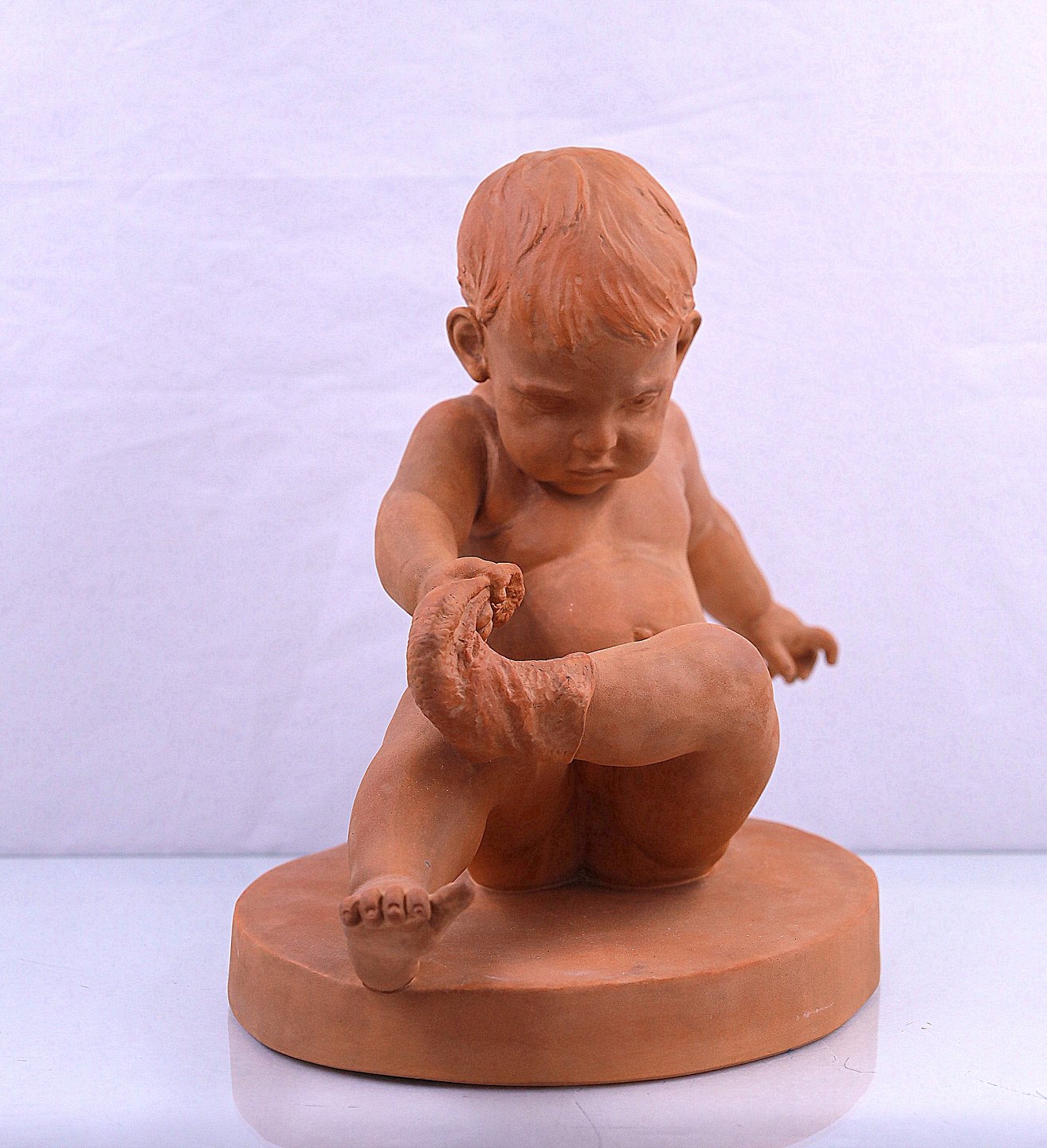 P. Ipsen. Strømpedrengen nr. 347. Figuren er fremstillet af terrakotta og ikke glaseret. Strømpedrengen er formodentlig fremstillet efter Peter Ipsens død.