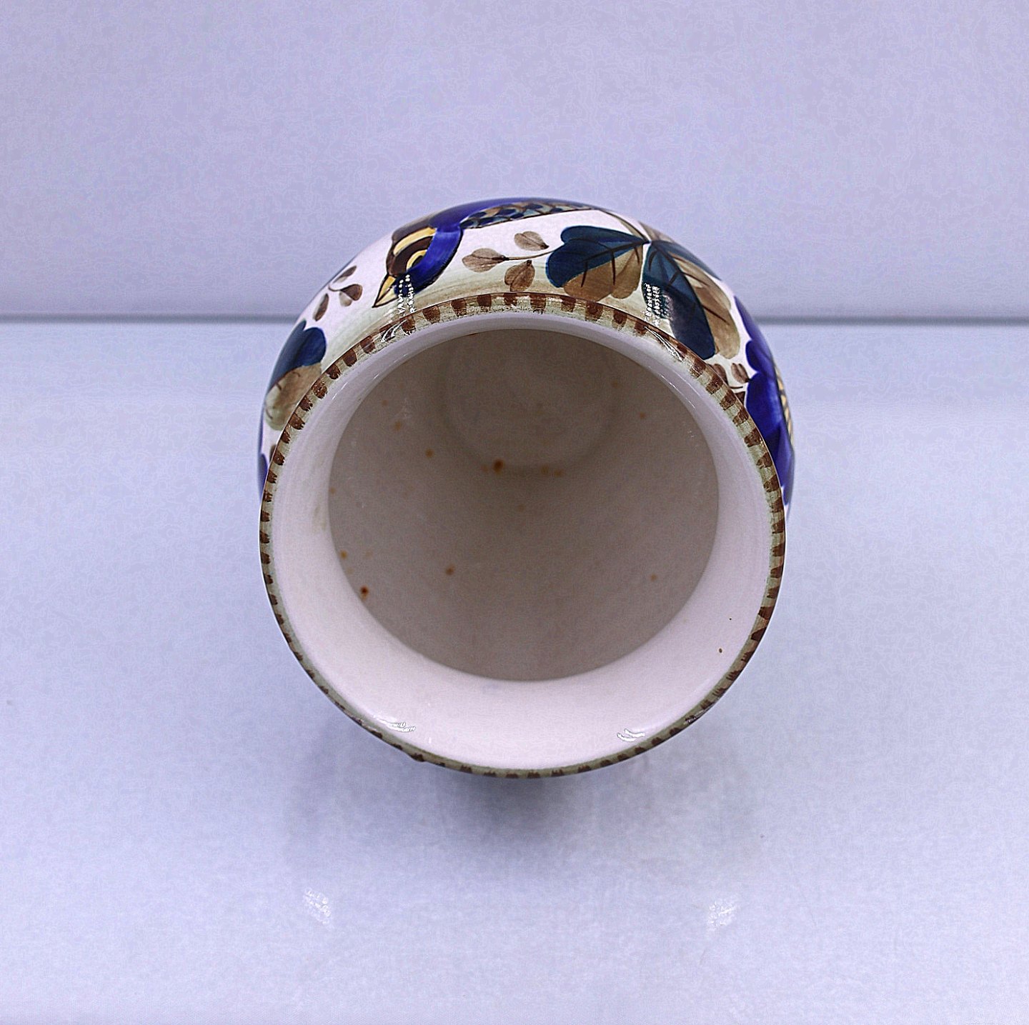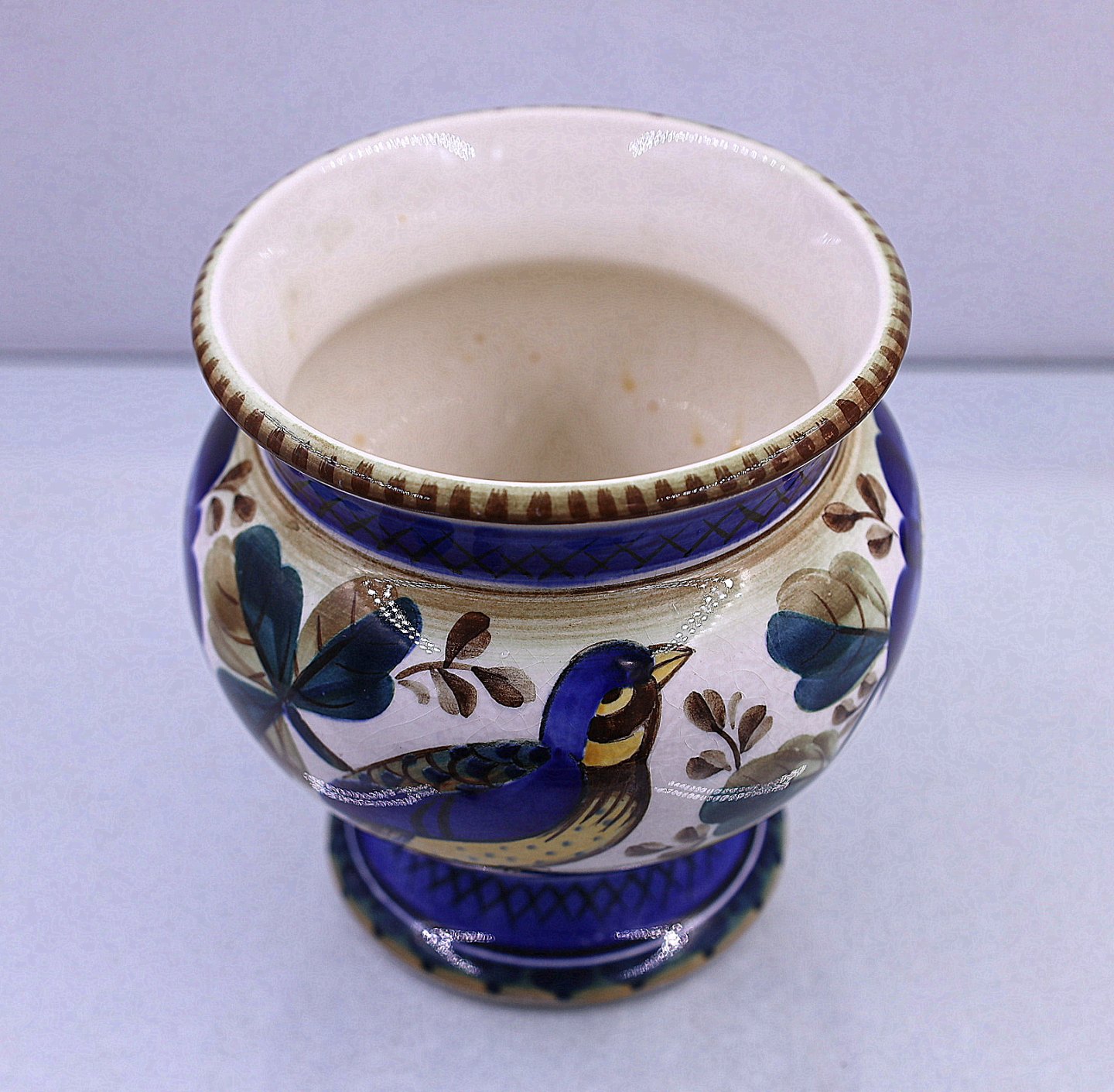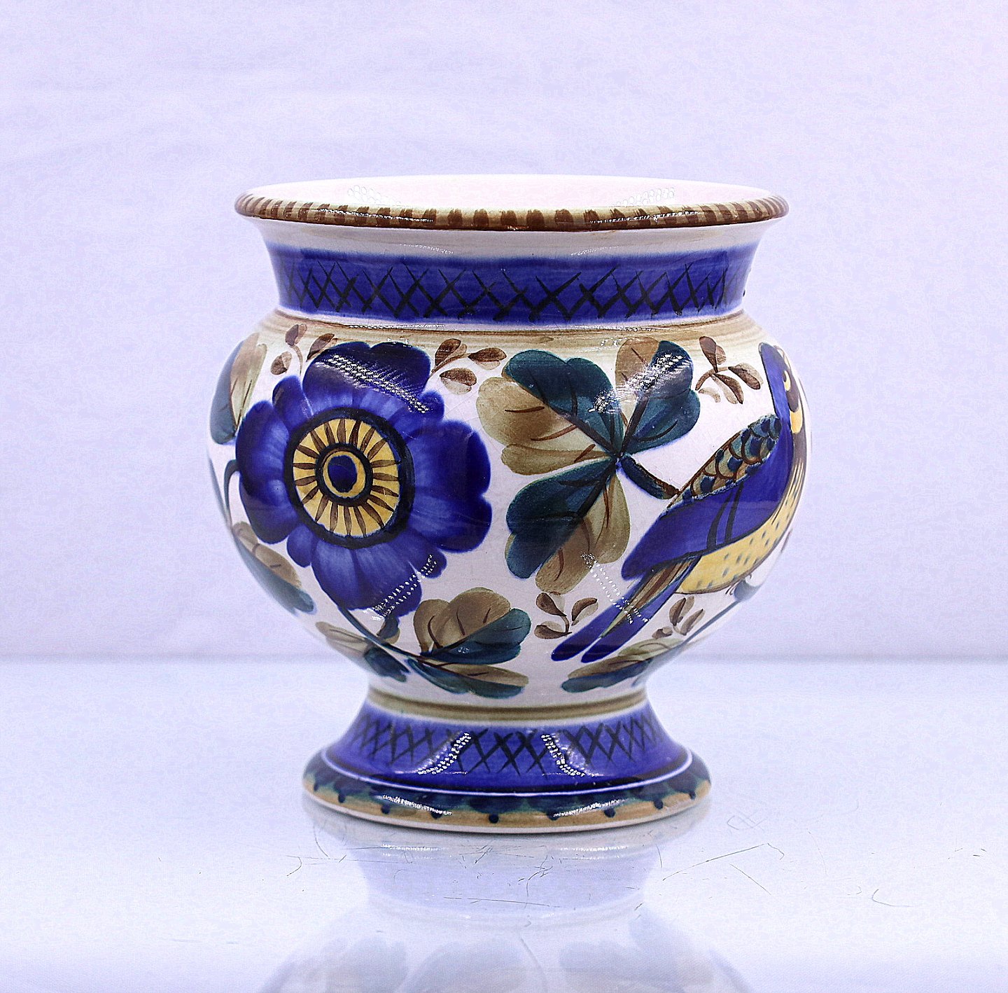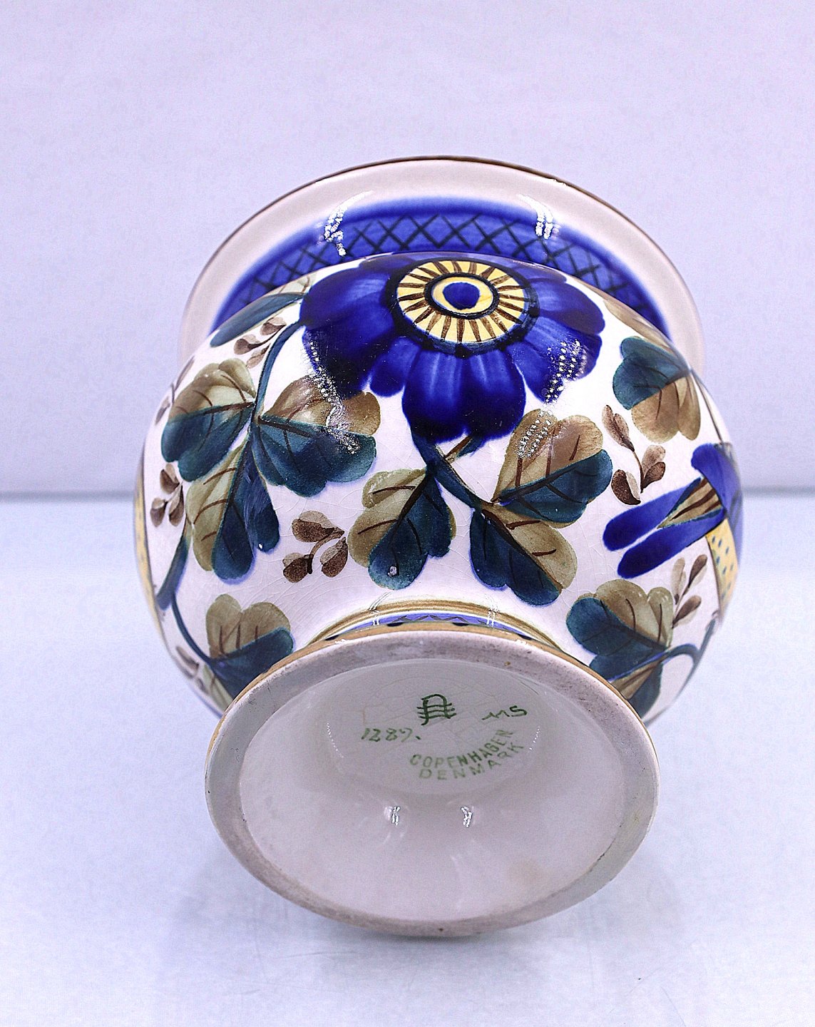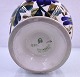 Aluminia, fajance, potteskjuler nr. 1289. Potten er dekoreret med blå fugle, blå blomster og blå/grønne blade.