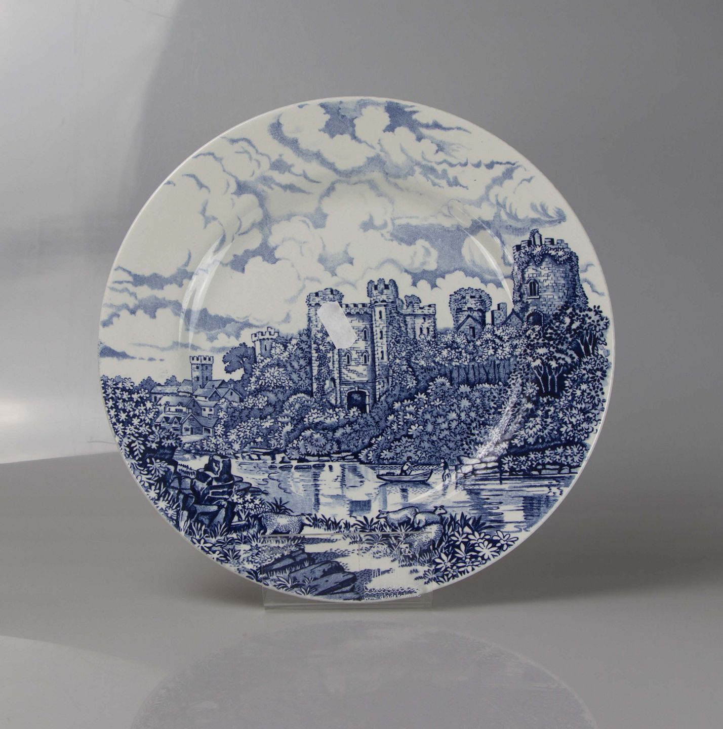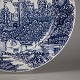 Tallerken i lys fajance med blådekoreret slotsmotiv.