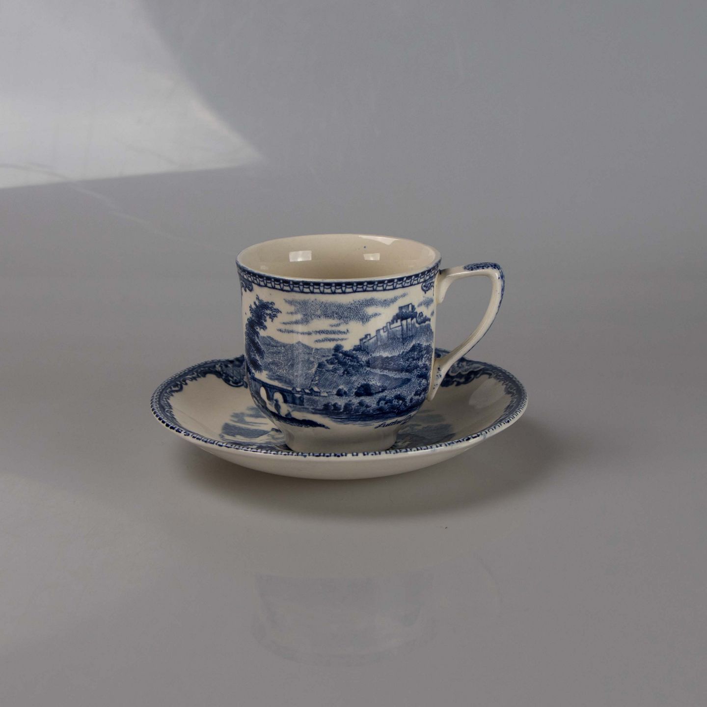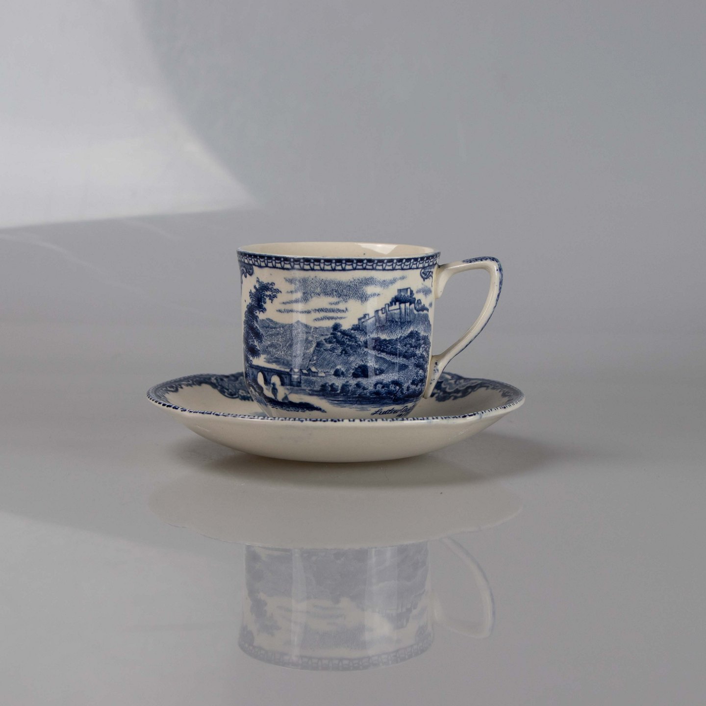 Moccakop med underkop i engelsk fajance fra stellet Old Britain Castles blue