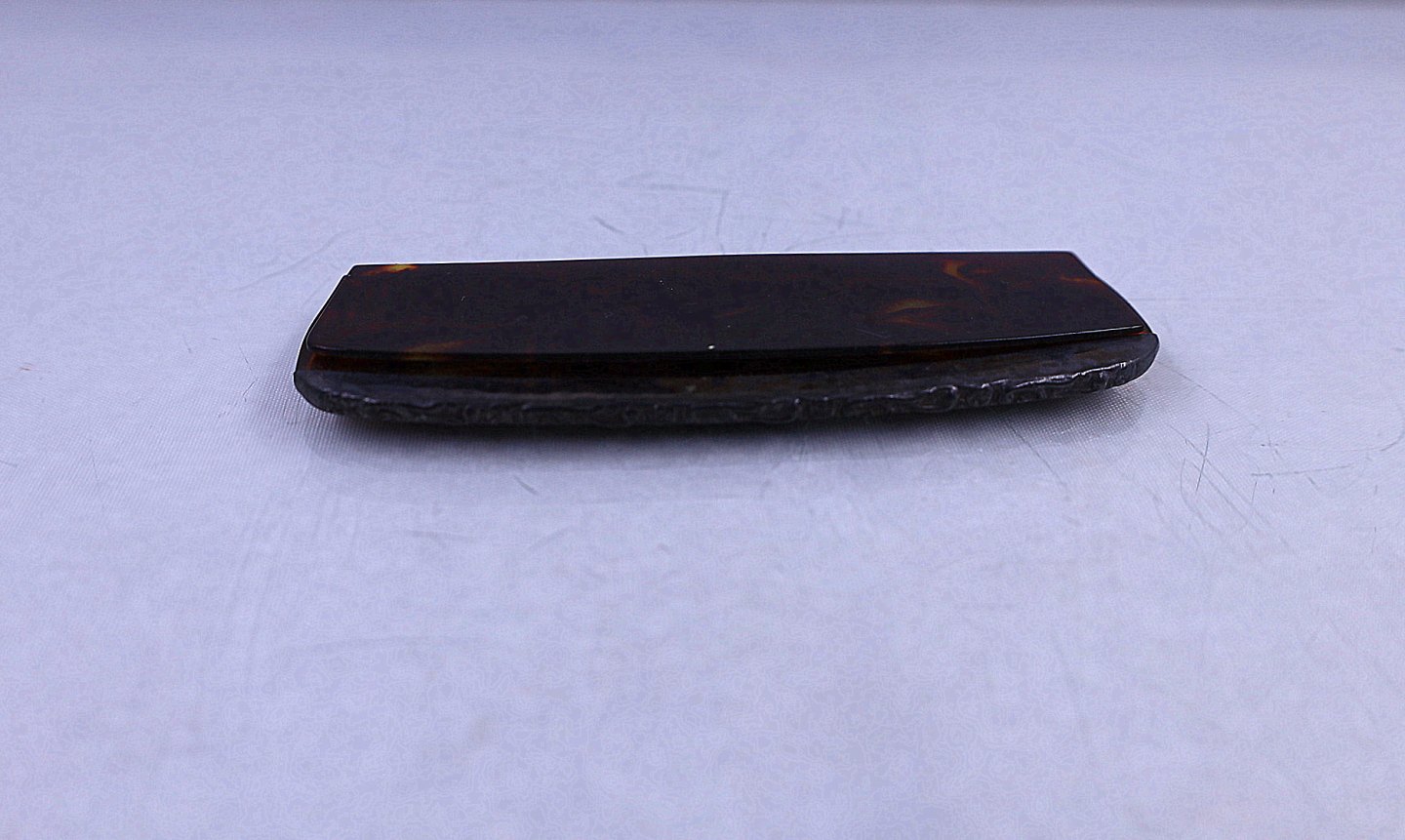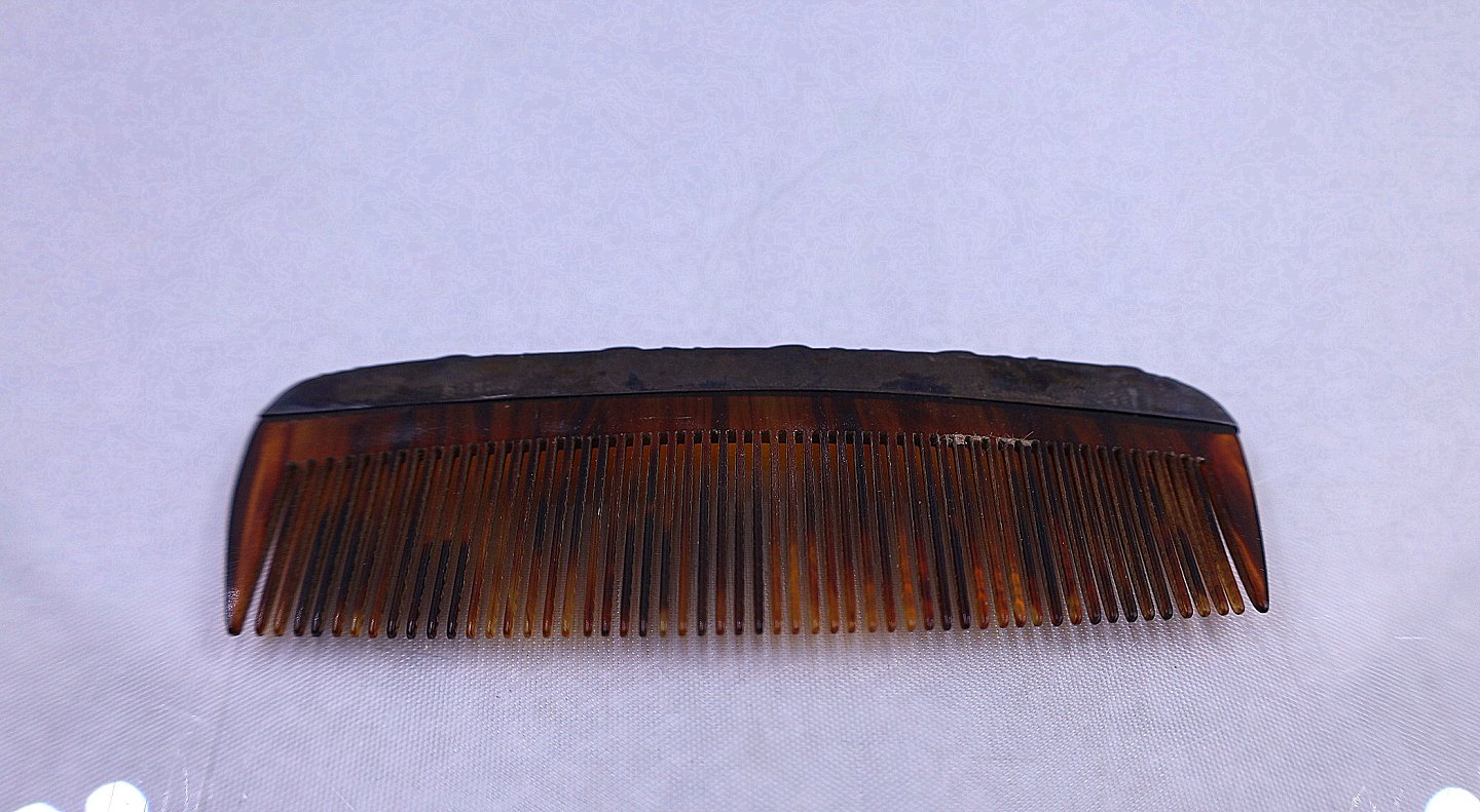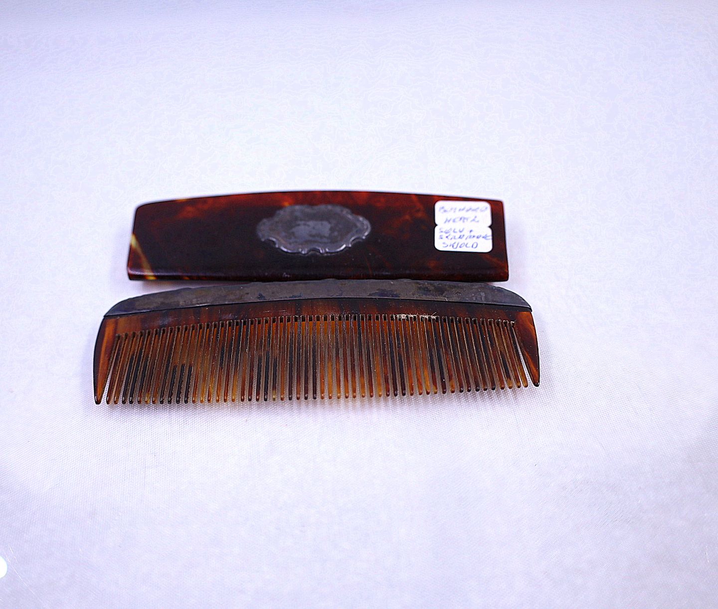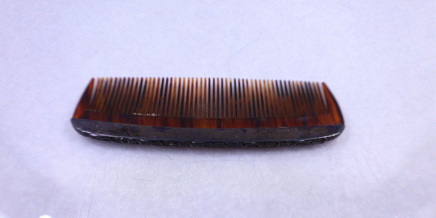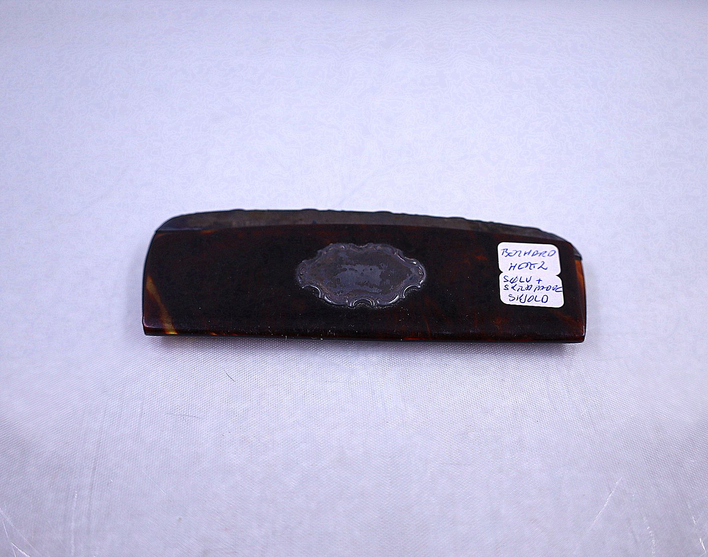 Kam med "etui". Kam og "etui" er af skildpaddeskjold, begge dele er prydet med sølv og lavet i skønvirkestil