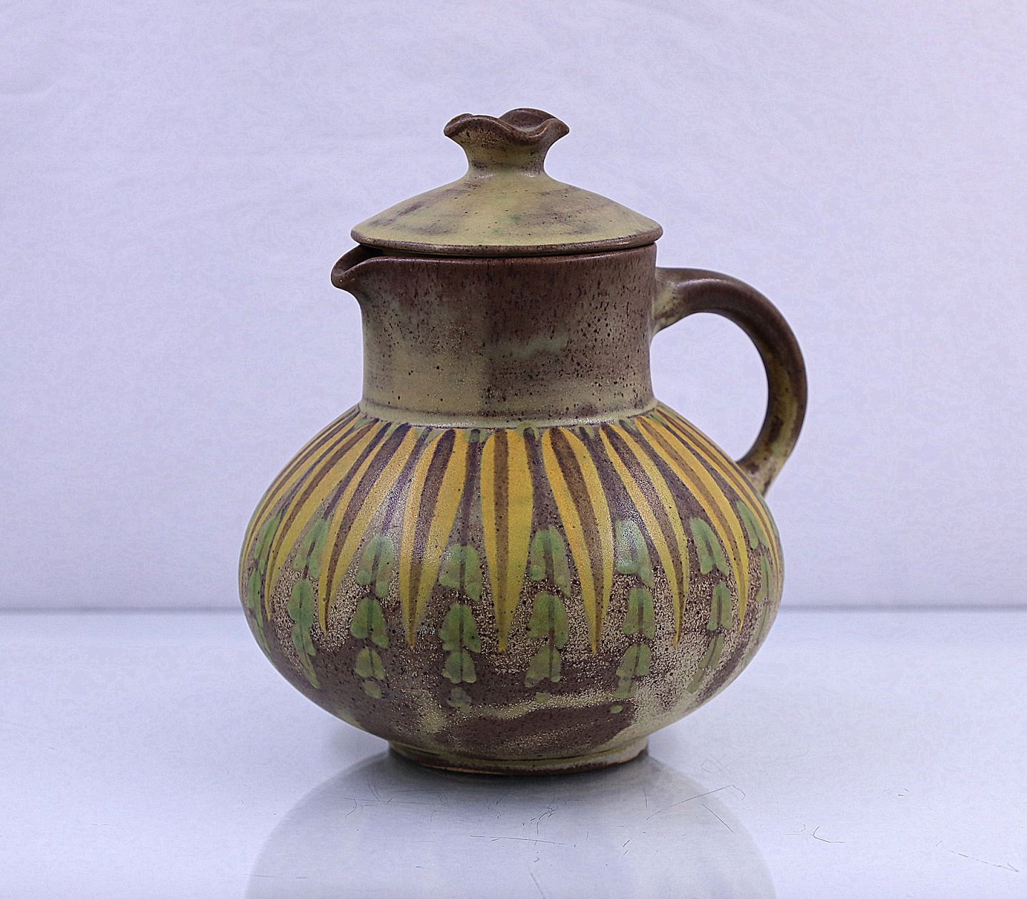 Dybdahl Keramik. Tekande med låg. Tekanden er grøn med gule blade.