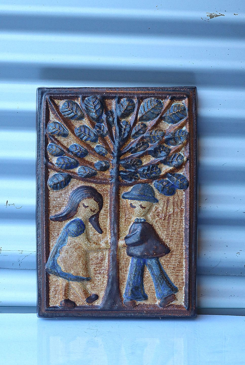 Søholm Keramik, relief, nr. 3584. Kvinde og mand, der står under et træ. " Forårs kærlighed". Relief af Joseph Simon, 1970`erne.