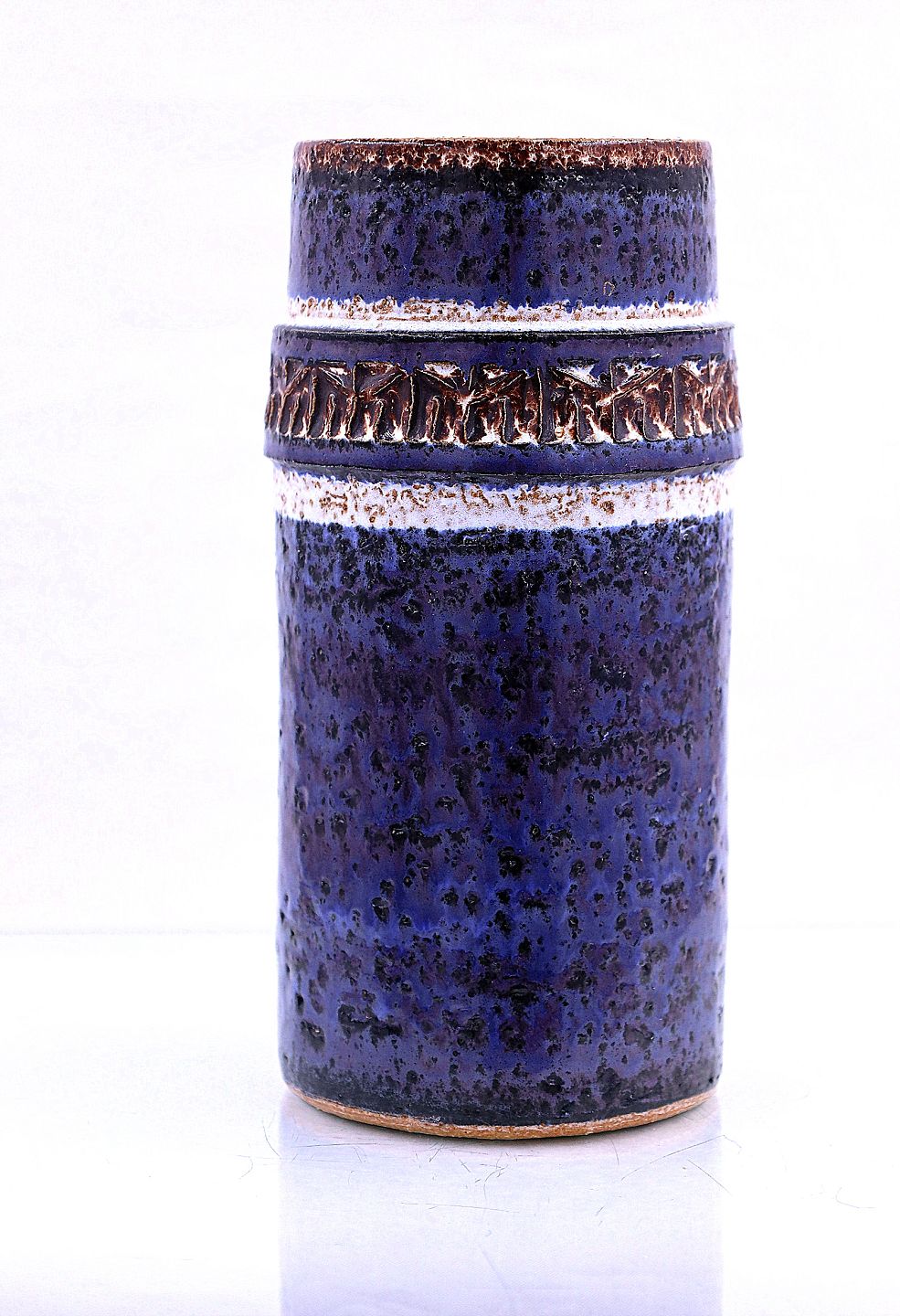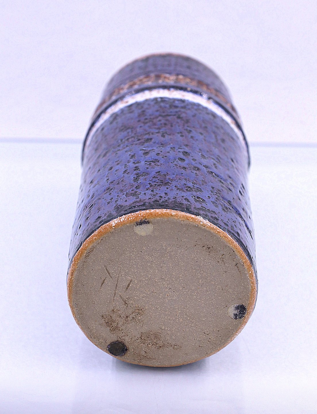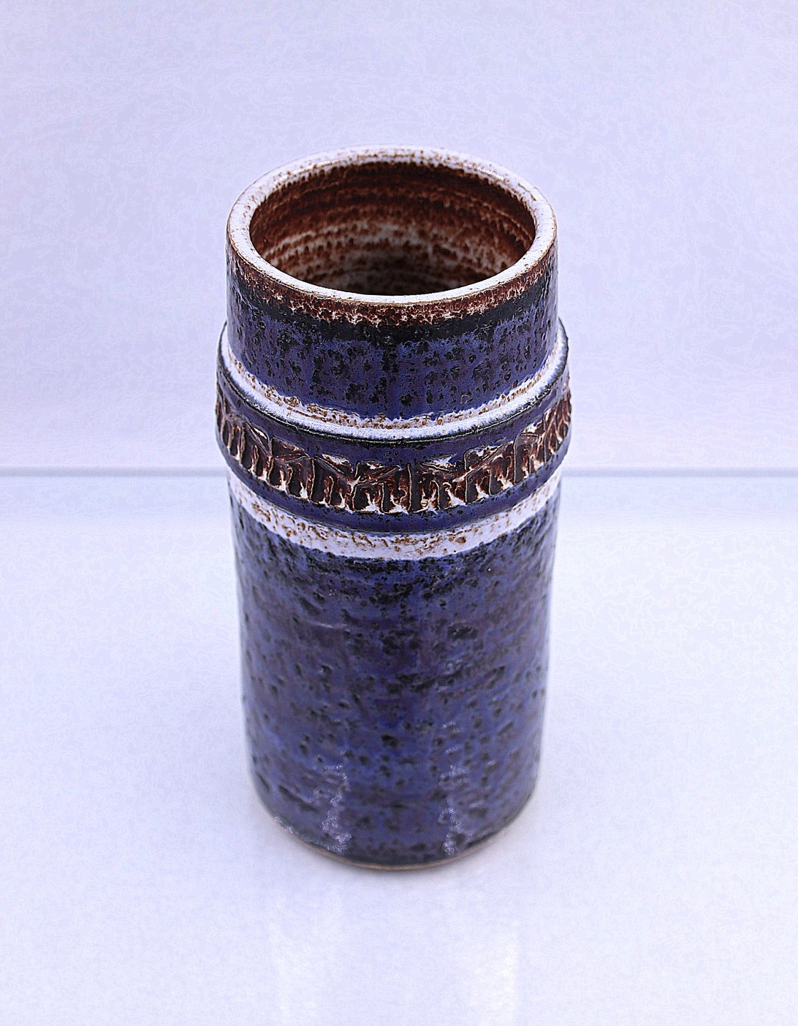 TK-Keramik vase. Cylinderformet vase, vasen er glaseret blå med brun og hvid kant. Vasen er brun indvendig.