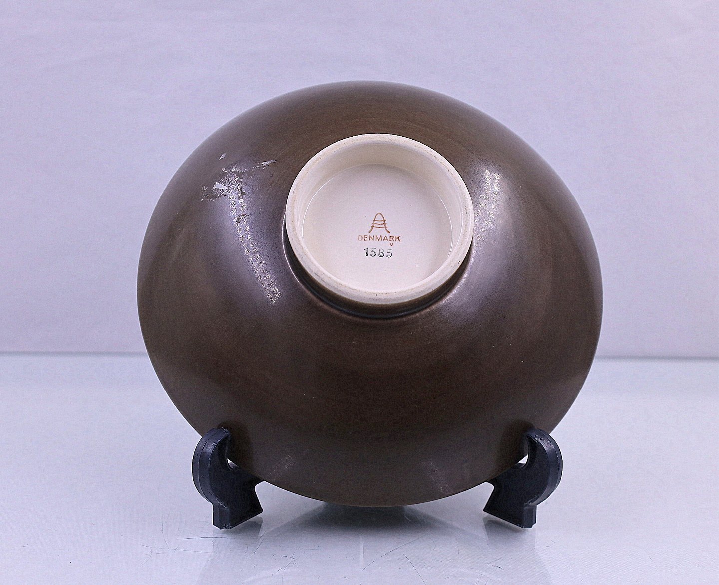 Aluminia. Skål, Solbjerg 1585. Chokoladebrun skål på fod, skålen er dekoreret med fisk i relief.