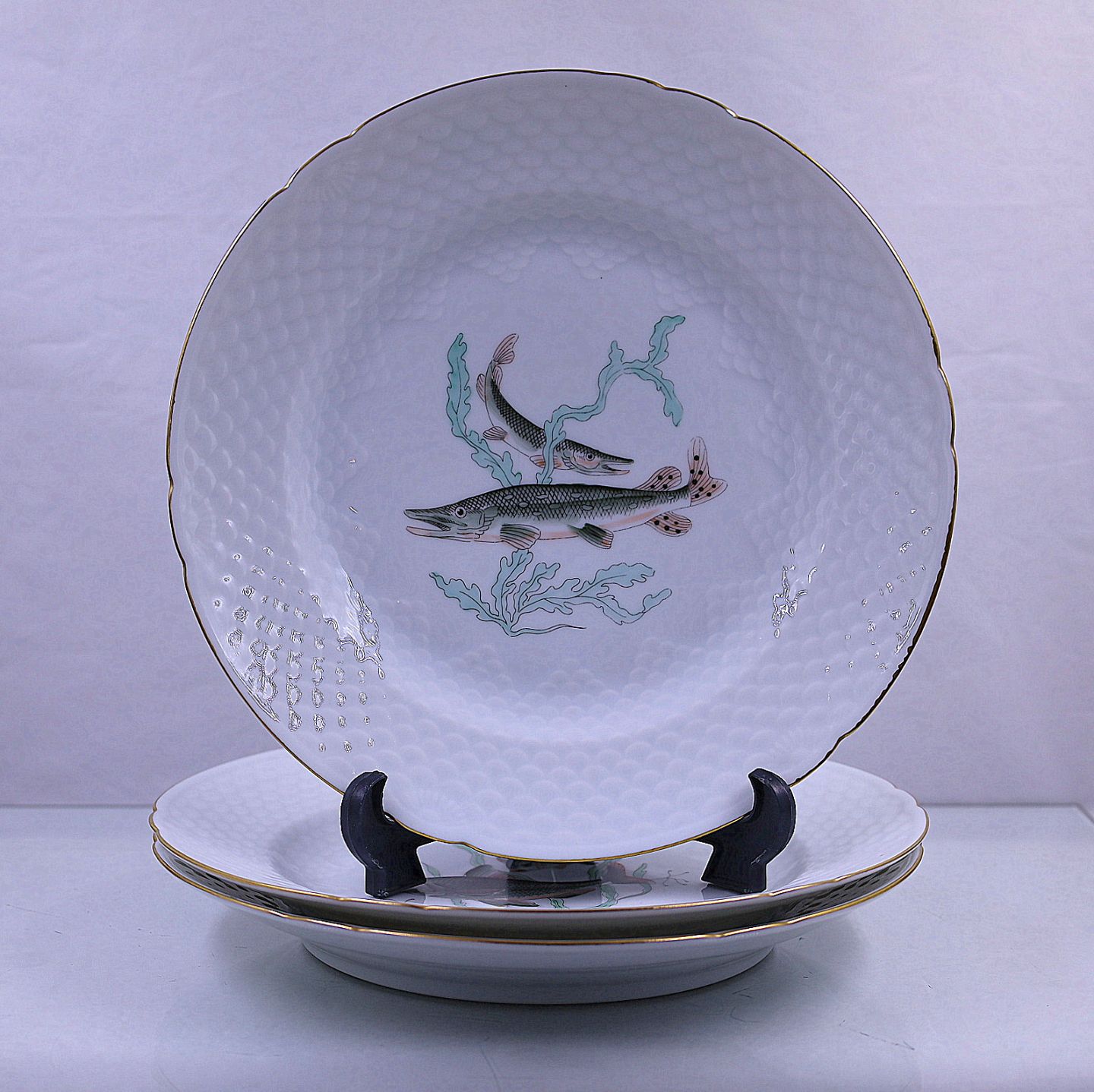 Bing & Grøndahl Hostrup. Fisketallerken, nr. 25. Motivet er 4. Gedde (Esox lucius). Tallerkenen er af hvidt porcelæn med skelkant og guldkant.