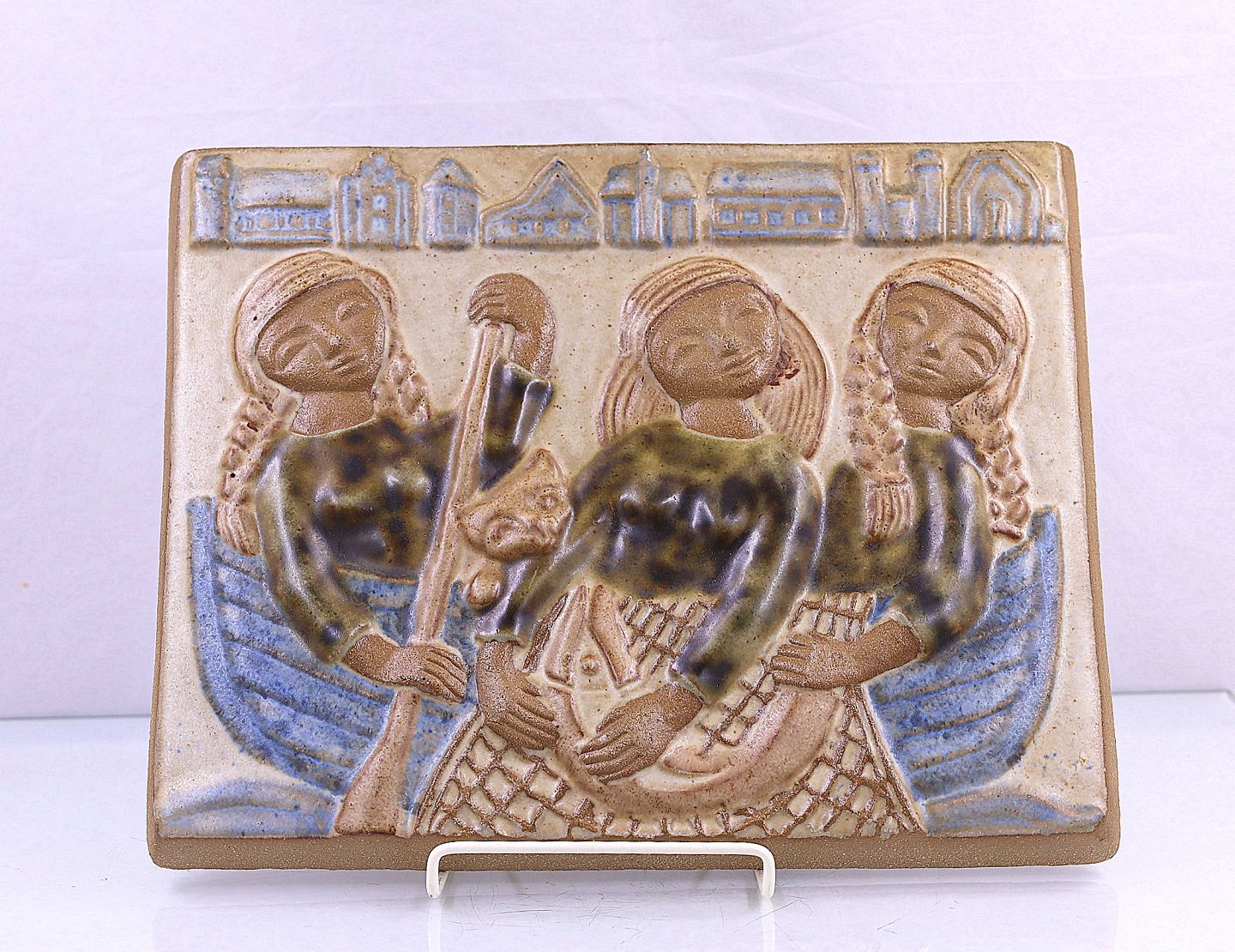 Michael Andersen & Sønner. Relief, nr. 6055, med 3 glade, unge, piger i en båd. Dekoreret med blå, beige og brune farver.
