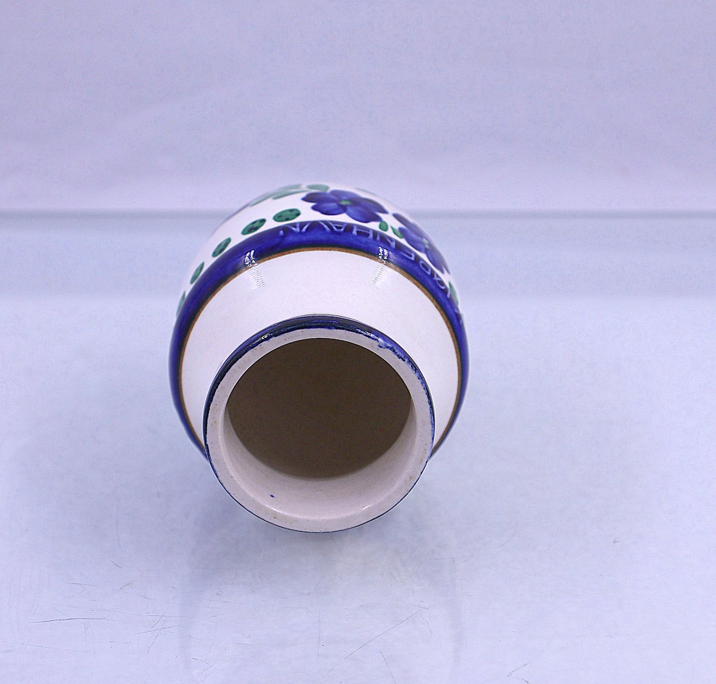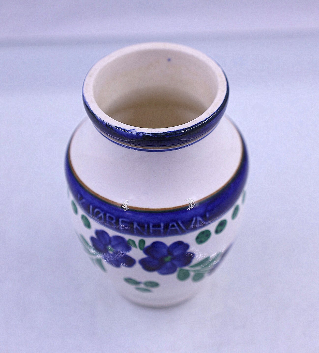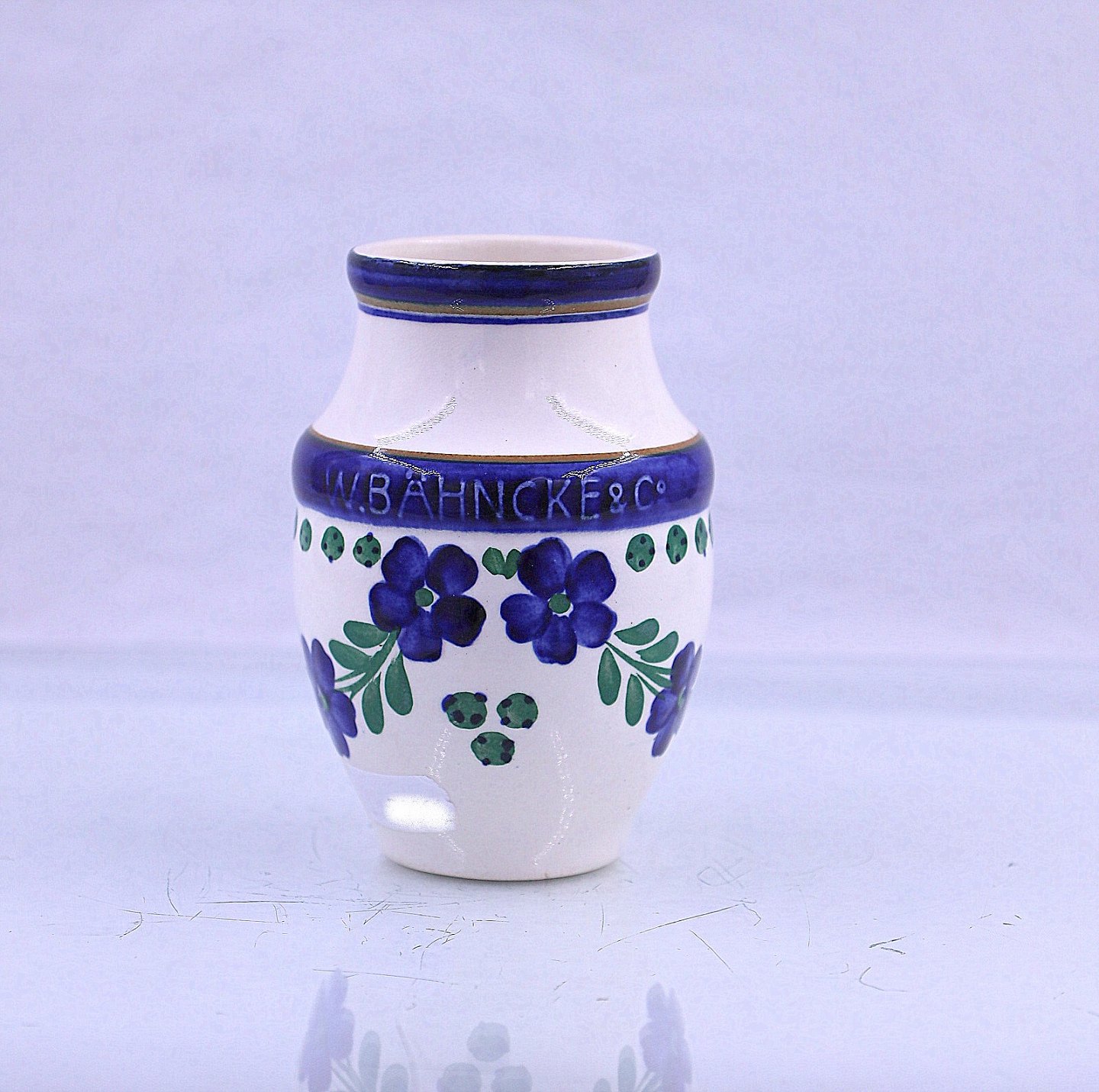 Aluminia. Fajance flaske, blå blomster og grønne blade. Den har indskriften KJØBENHAVN, W. BÄHNCKE & Co. Der er ikke stempelet.
