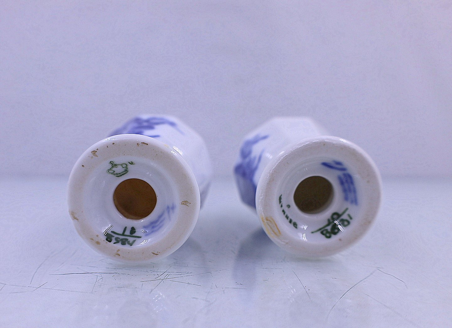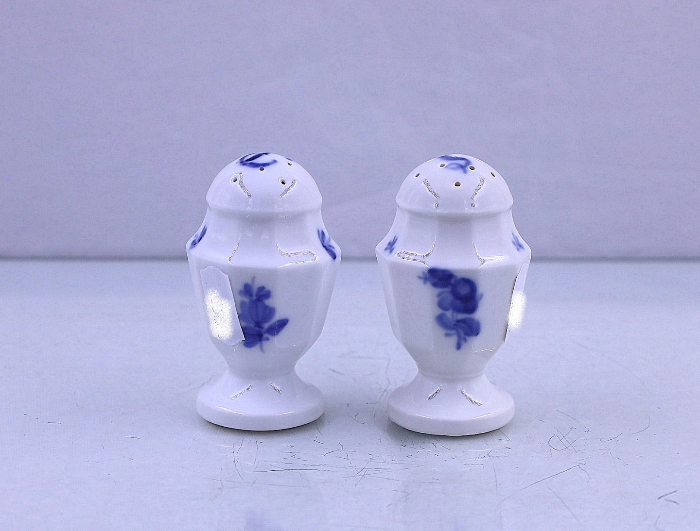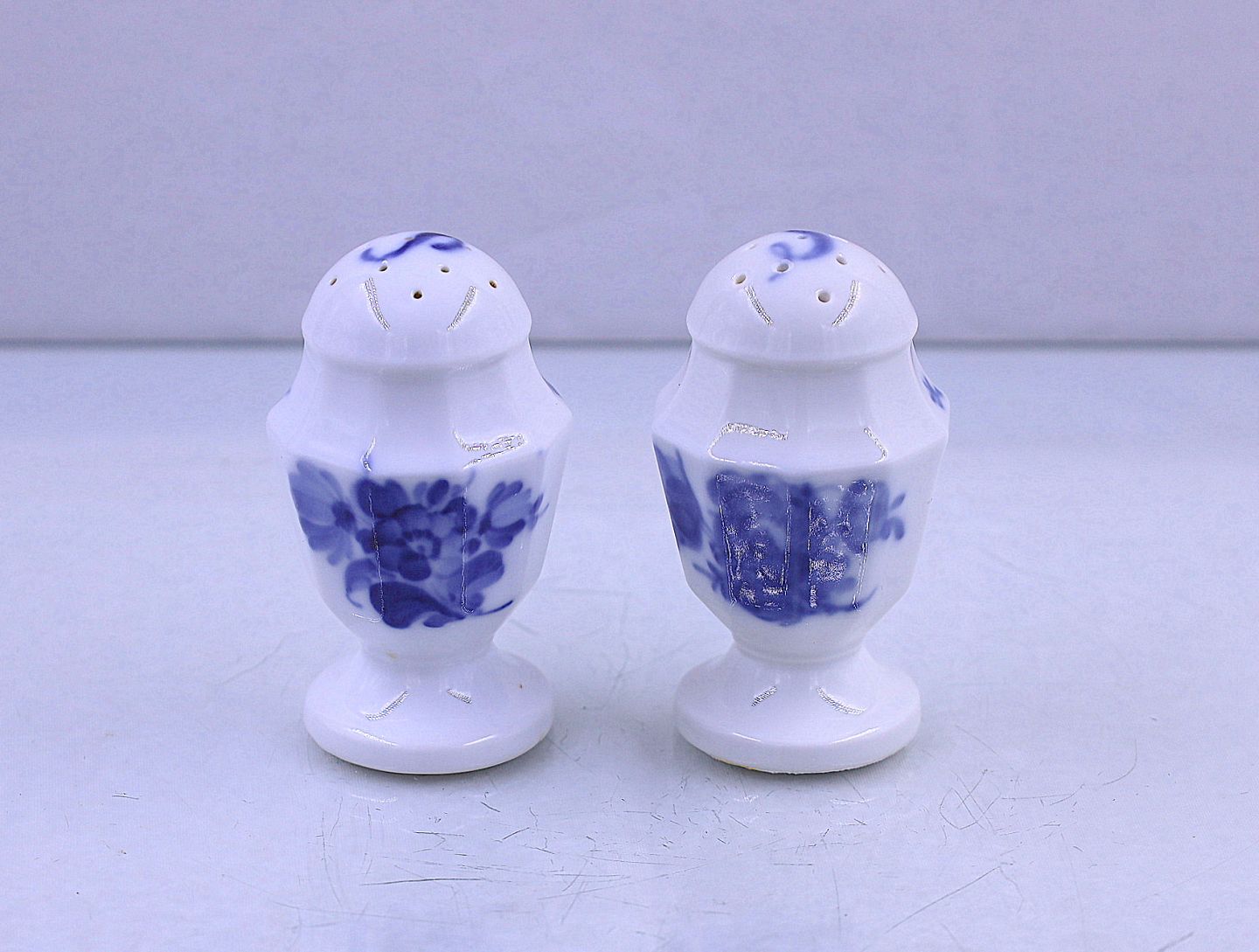 Royal Copenhagen. Saltbøsse nr. 10/8681l, peberbøsse nr. 10/8584, kantet. Blå blomst hører til rækken af hvid og blå porcelæn Royal Copenhagen har lavet.