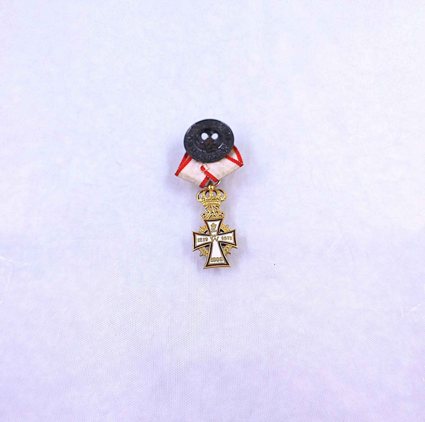 14 karat guld miniature Dannebrog. Malteserkors i hvid emalje, med krone. Korset har også et bånd og knap, til påsyning.