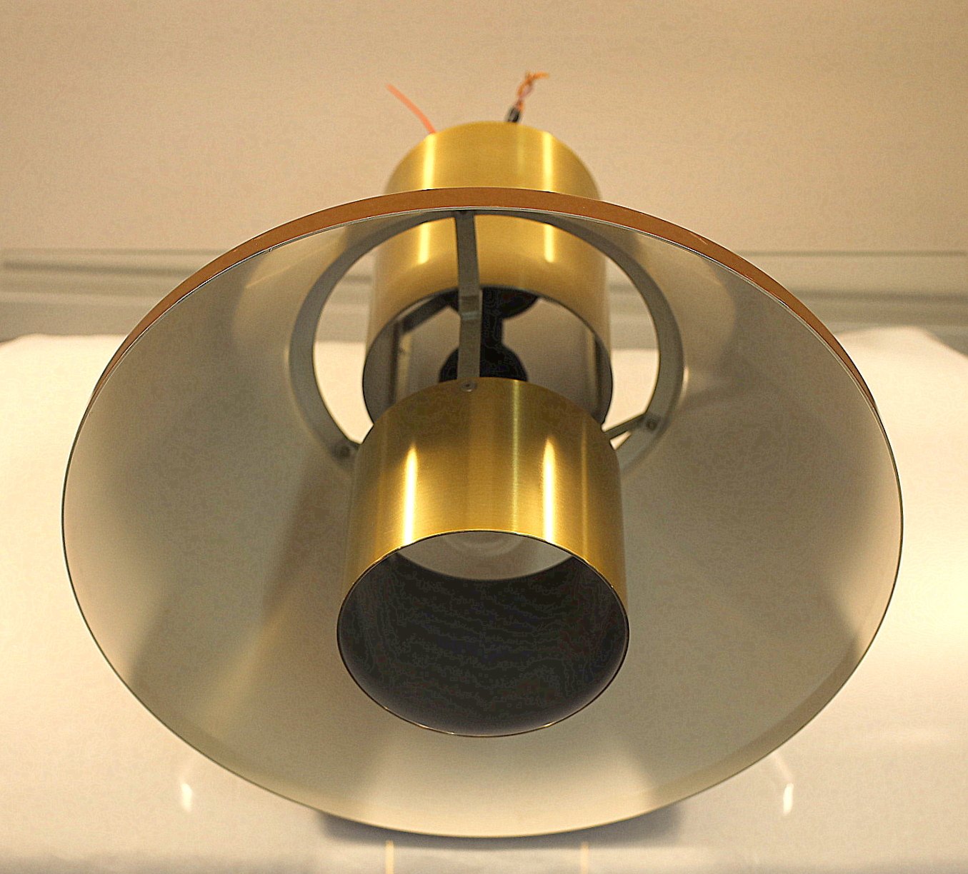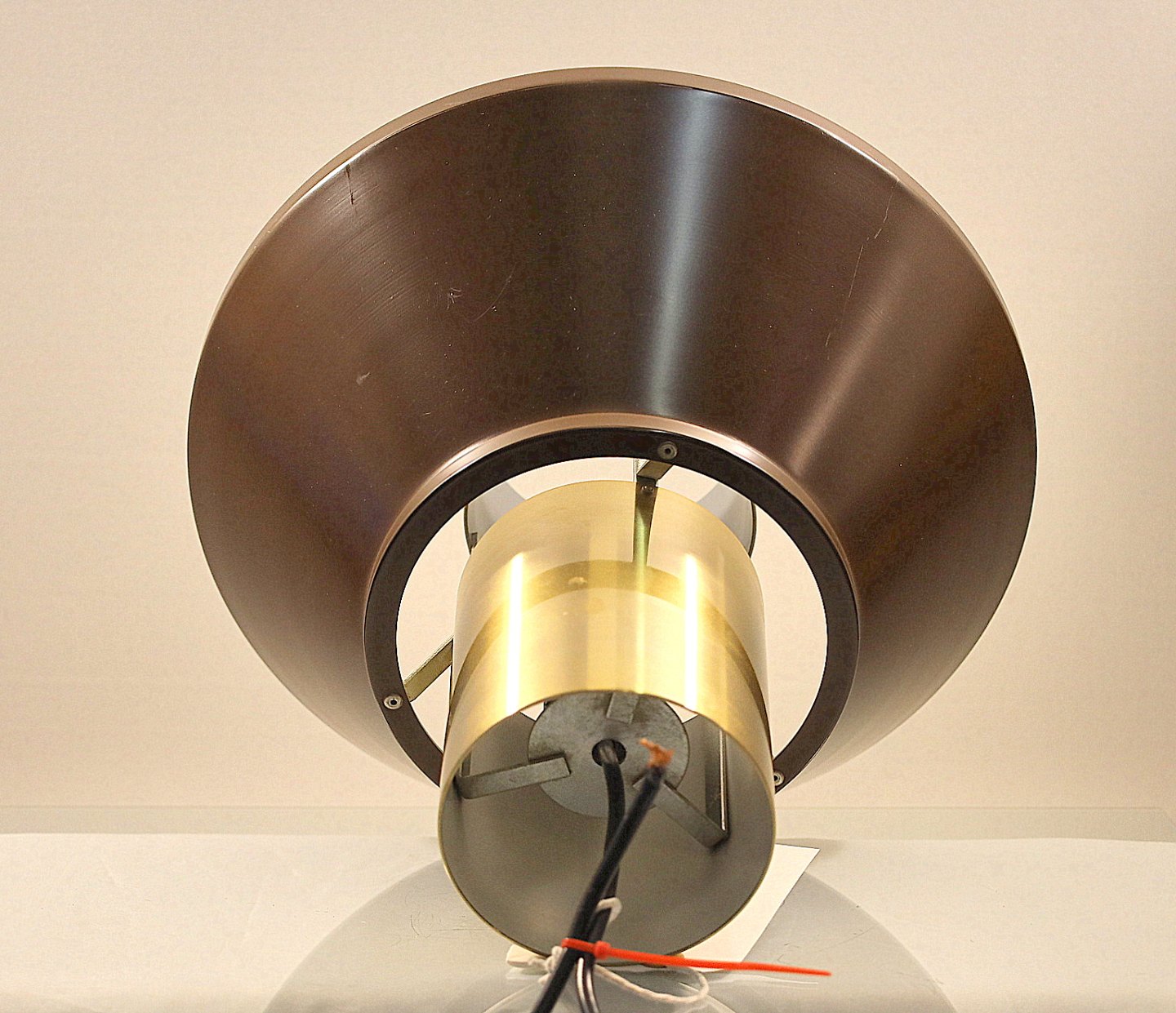Pendel. Life pendel, brun skærm med messing rør, pendlen er, mat, hvidlakeret indvendig.