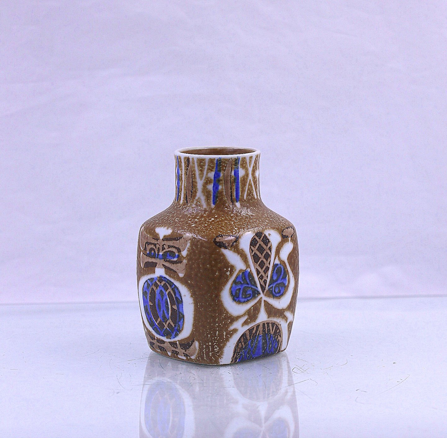 Vasen er dekoreret med brunt/blåt abstrakt mønster.