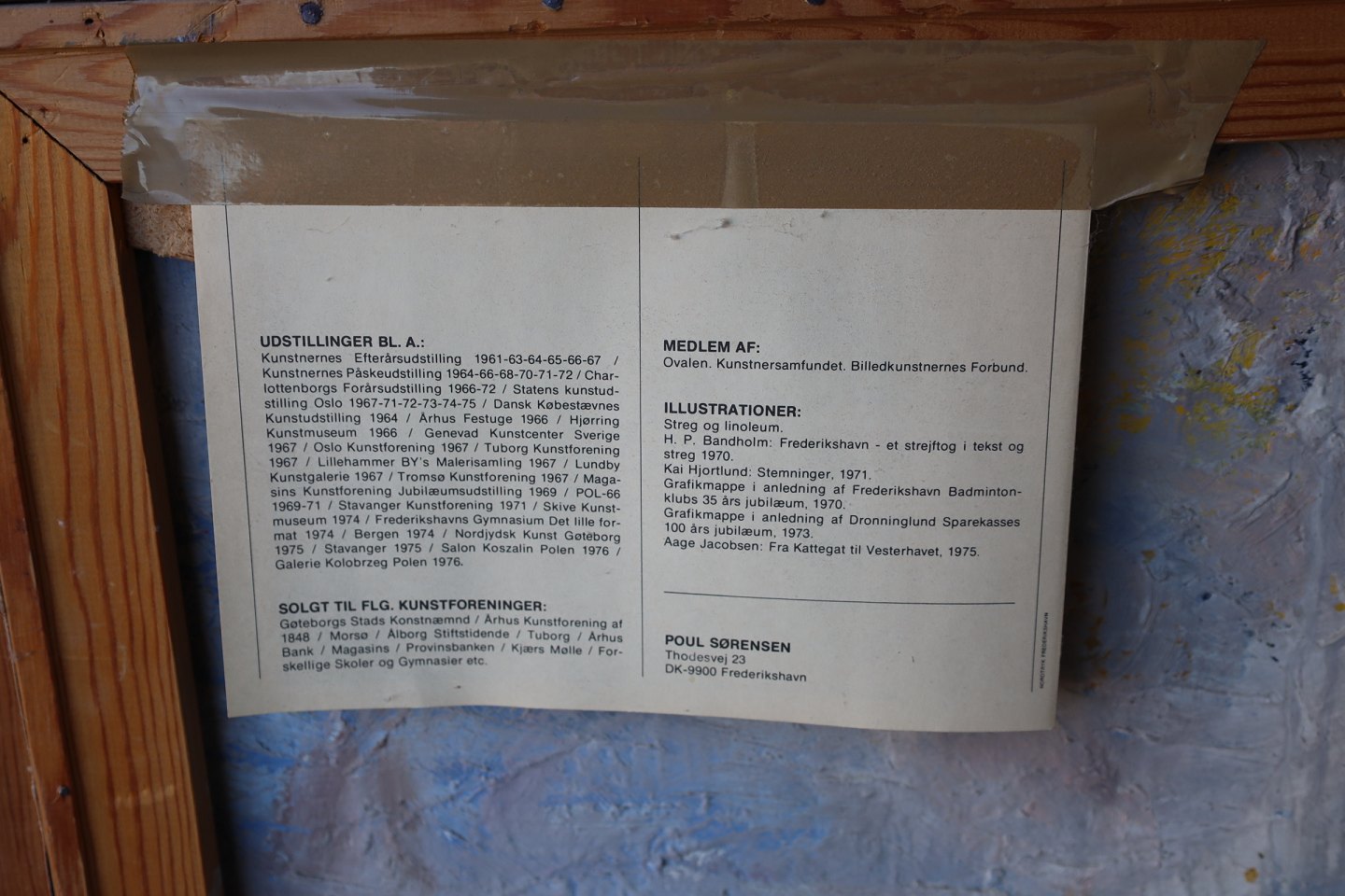 Maleri. Poul Sørensen født 1931-død 2018. Maleri af fiskerhuse, i Frederikshavn, hvor maleren har ladet maleriet fortsætte ud over rammen, guldramme, og således patenteret rammen. Maleri med fiskerhuse i forskellige farver og en jolle, der ligger på hovedet, i forgrunden. Maleren har også malet bagsiden.