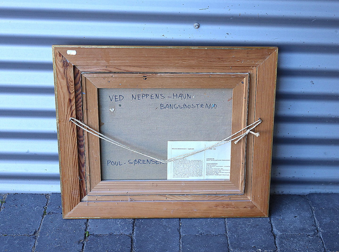 Maleri Poul Sørensen, født 1931-død2018. Maleri, fiskerhus ved Neppens-Havn, Bangsbostrand, Frederikshavn. Hvidt fiskerhus med rødt tag, i front et stengærde.