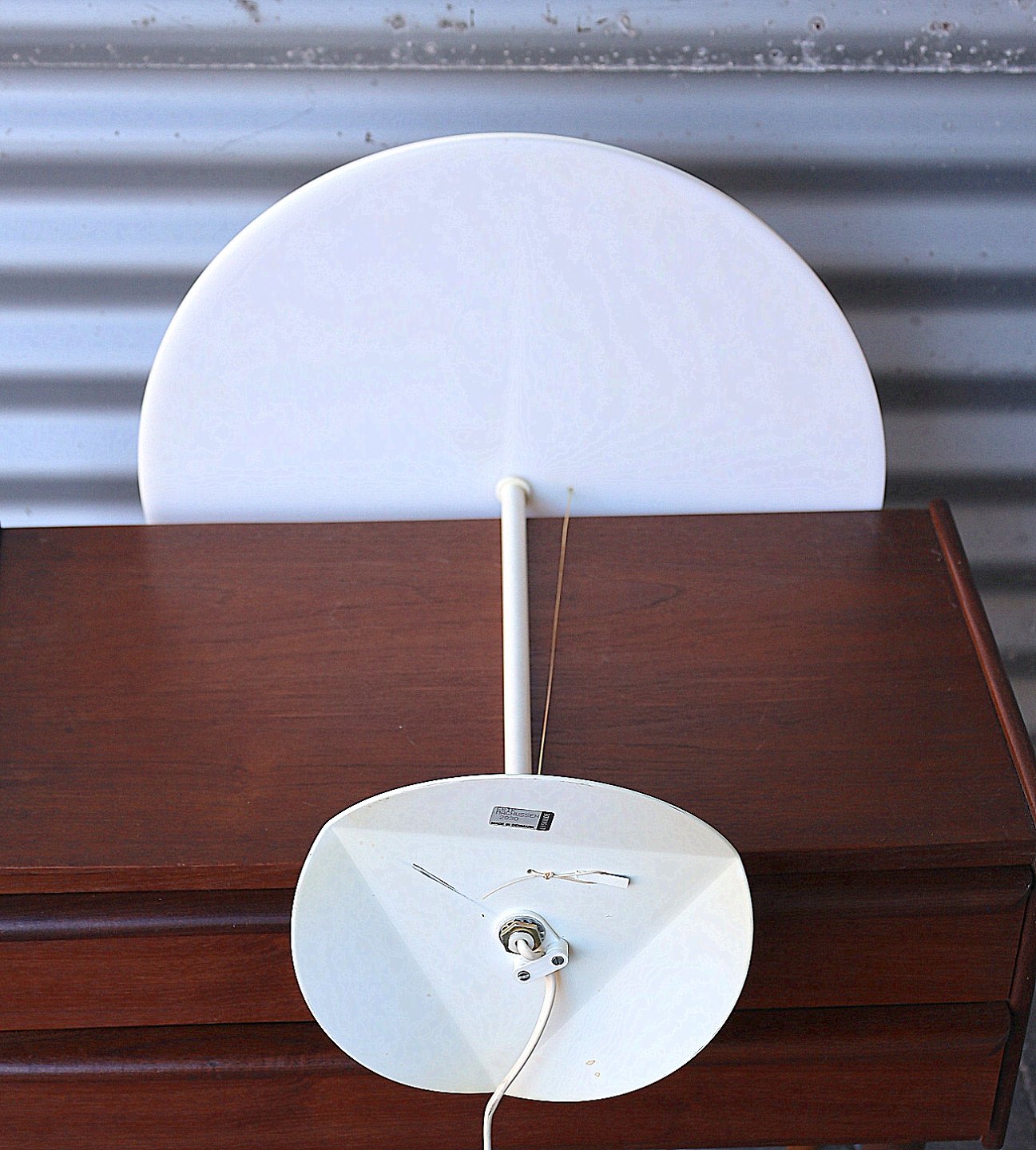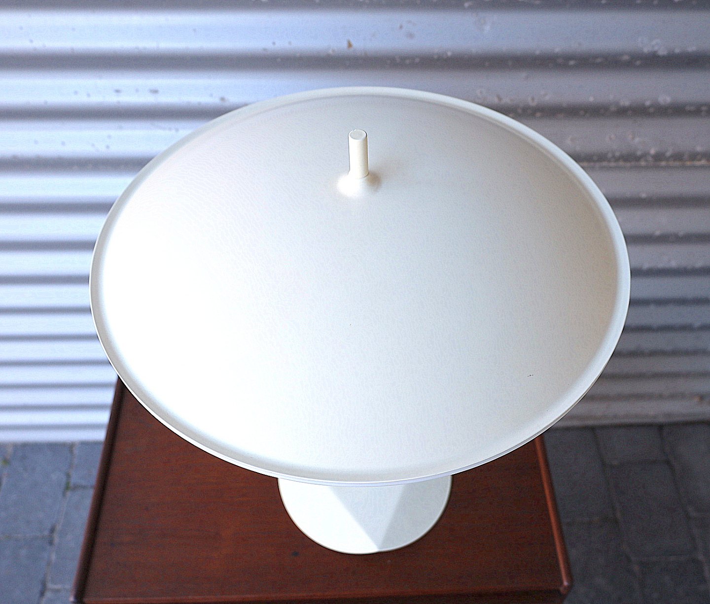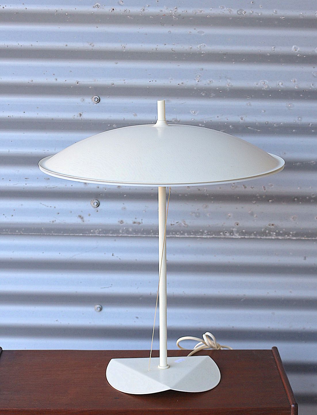 Erik Magnussen bordlampe, nr. 2830, fra Lyskilden. Bordlampen er af mat hvidlakeret metal og under skærm sidder der en plast skærm, lampen tændes og slukkes via snoretræk.