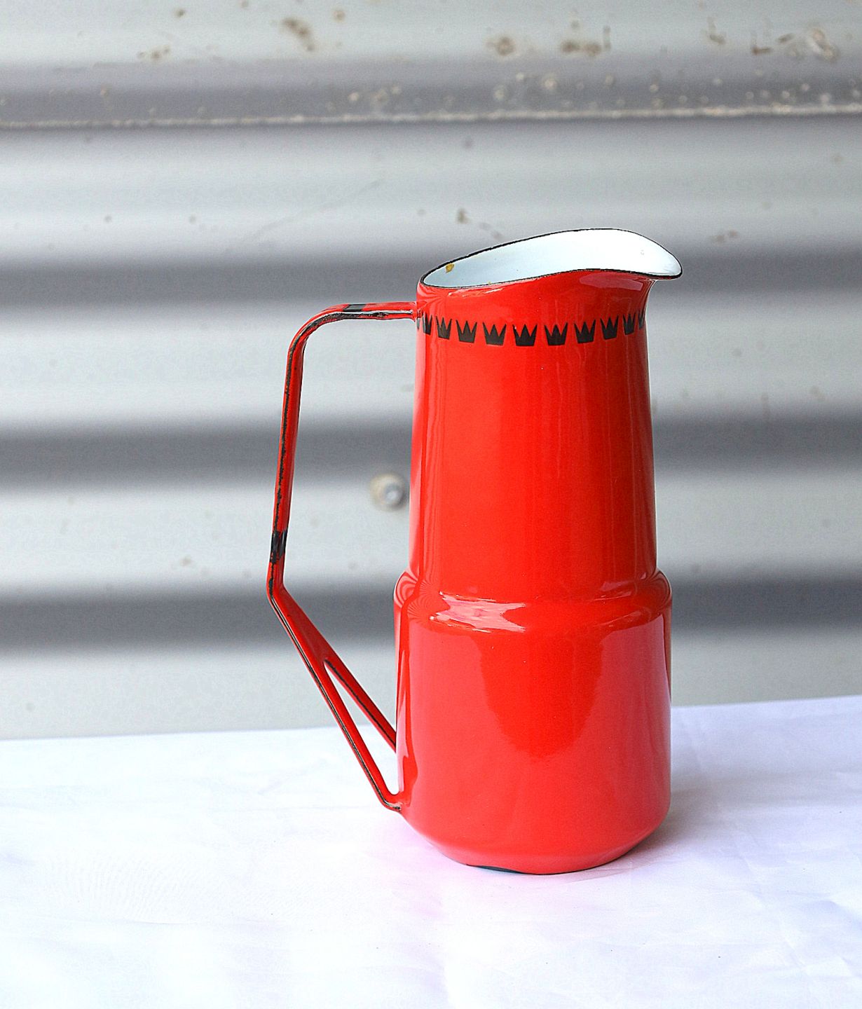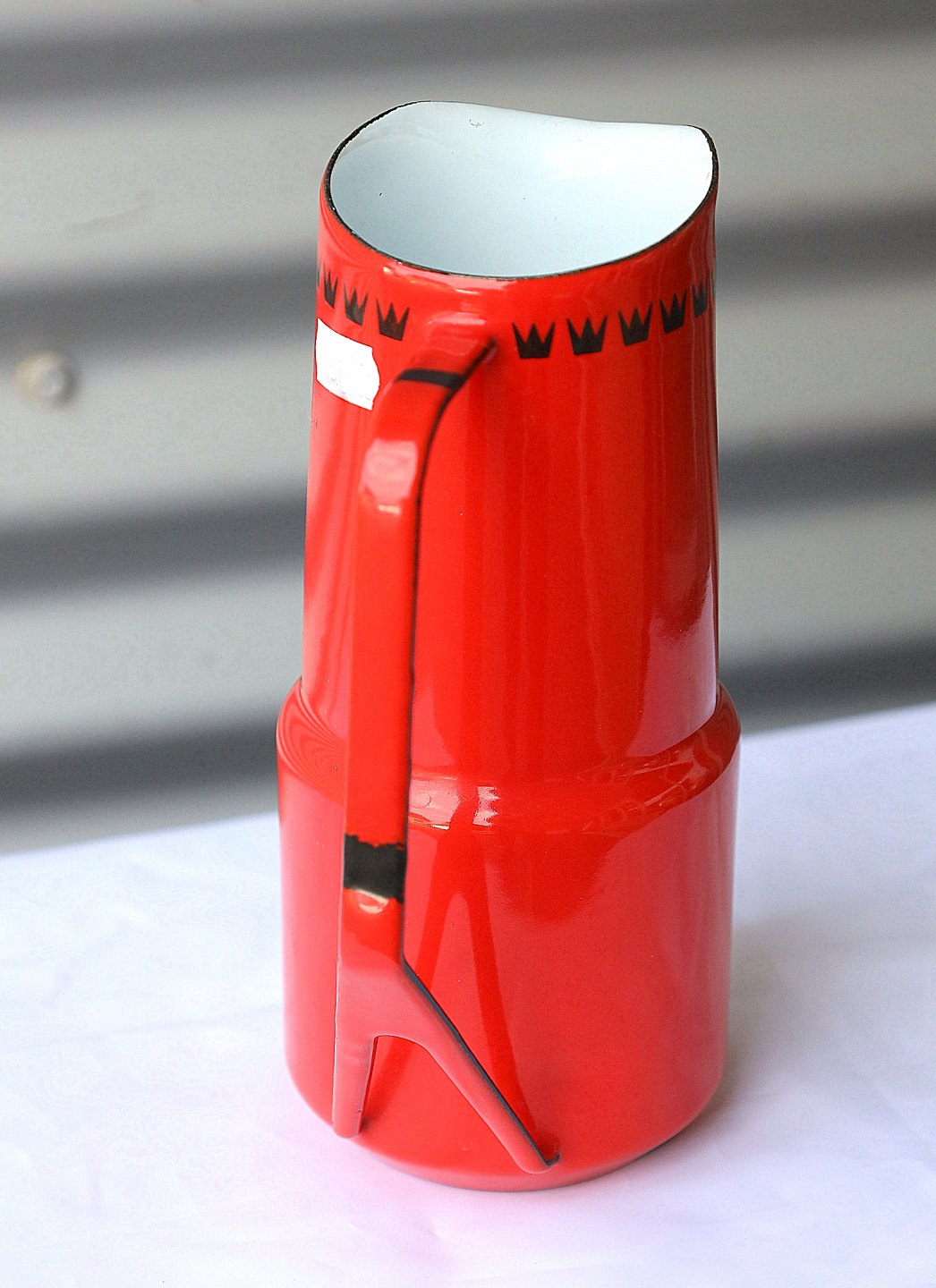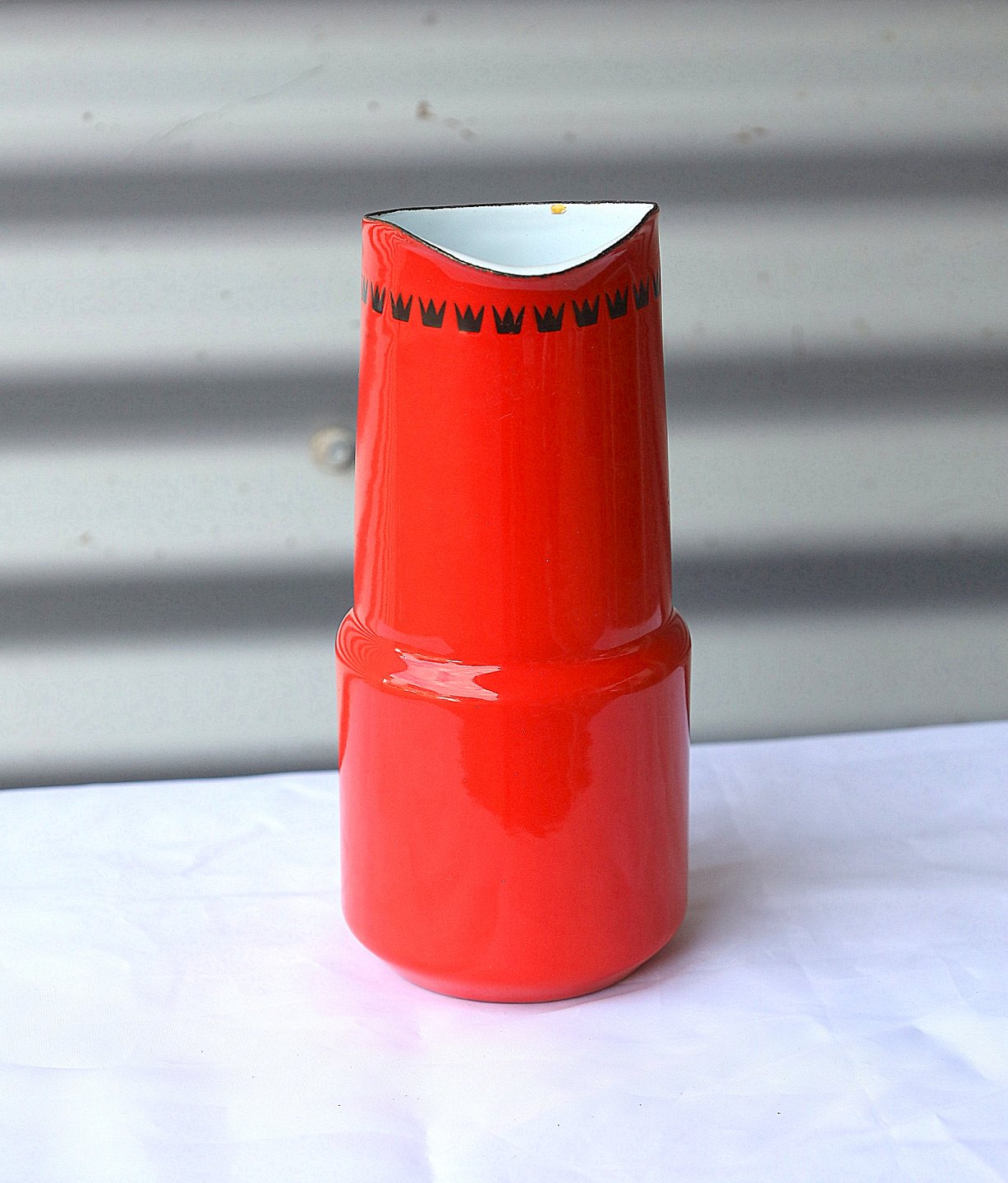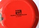 Orange/rød emaljekande, på kraven er der dekoreret med en krans af kroner.