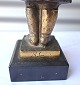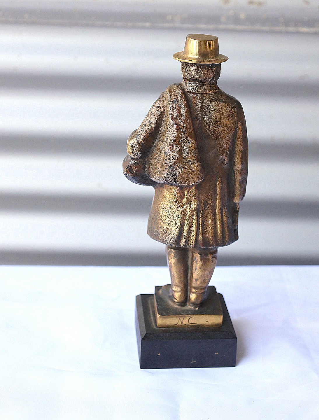 Bronze figur, eventuelt Naver. Figuren står på en træ fod, figuren har høj hat på og bærer på en vadsæk. På forsiden af figuren er der en tekst, svær at læse, på bagsiden er initialerne N. C.
