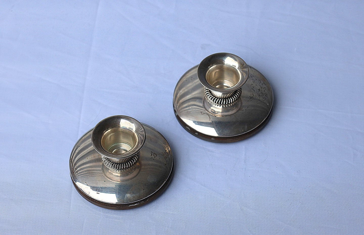 Lysestager stemplet "Silverco". "Silverco" lysestager 3-tårnet sølv, fra 1954. Lysestagerne er pyntet med en spiral. Bunden på stagerne er lavet af plastlignende materiale.