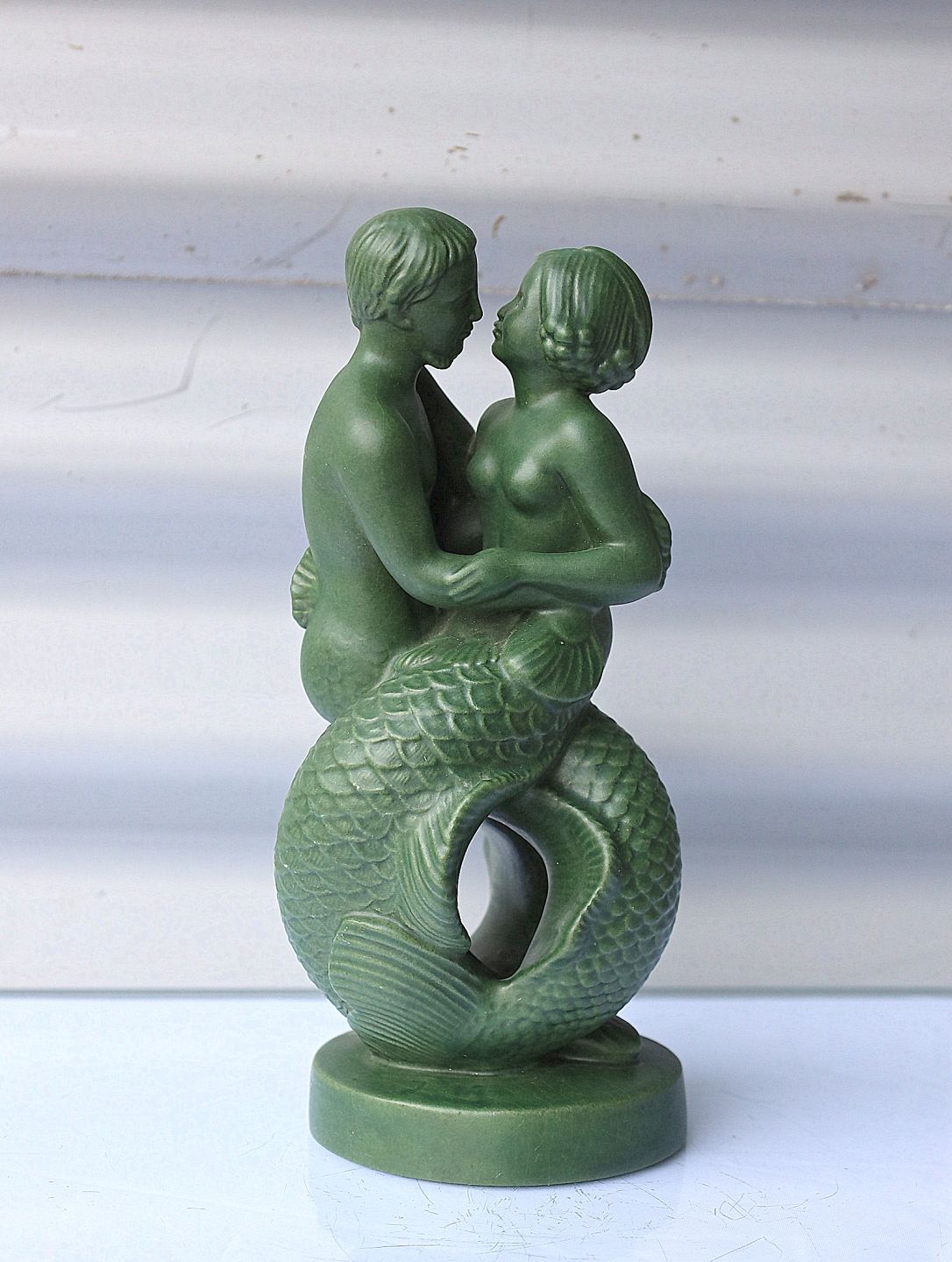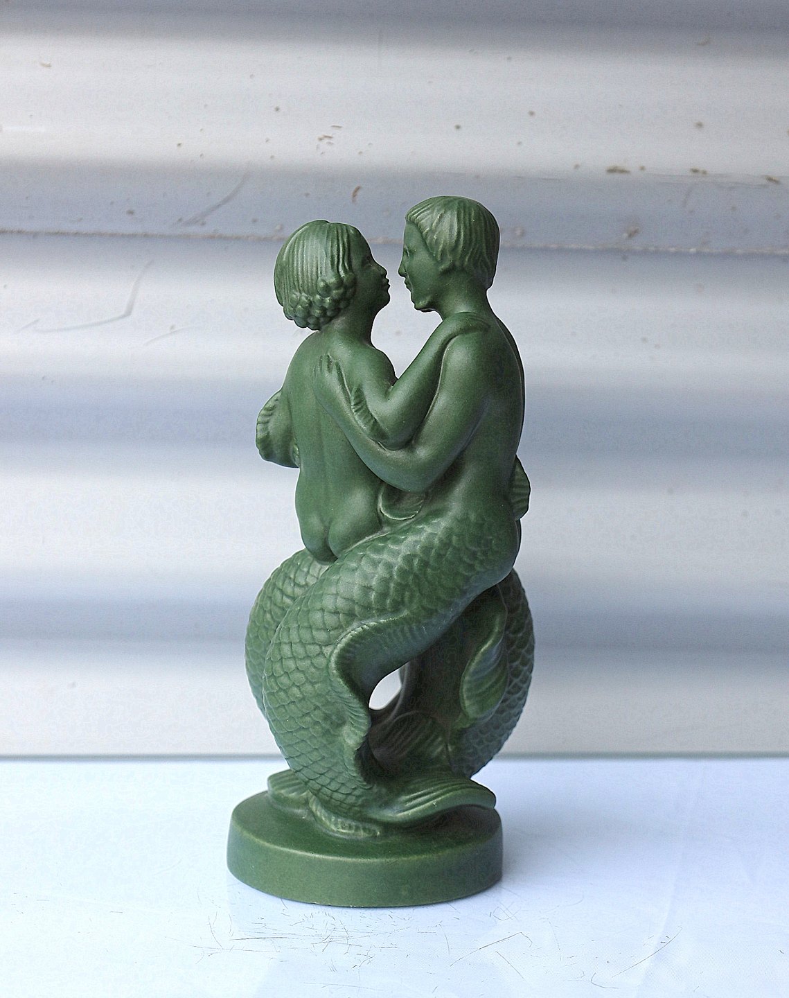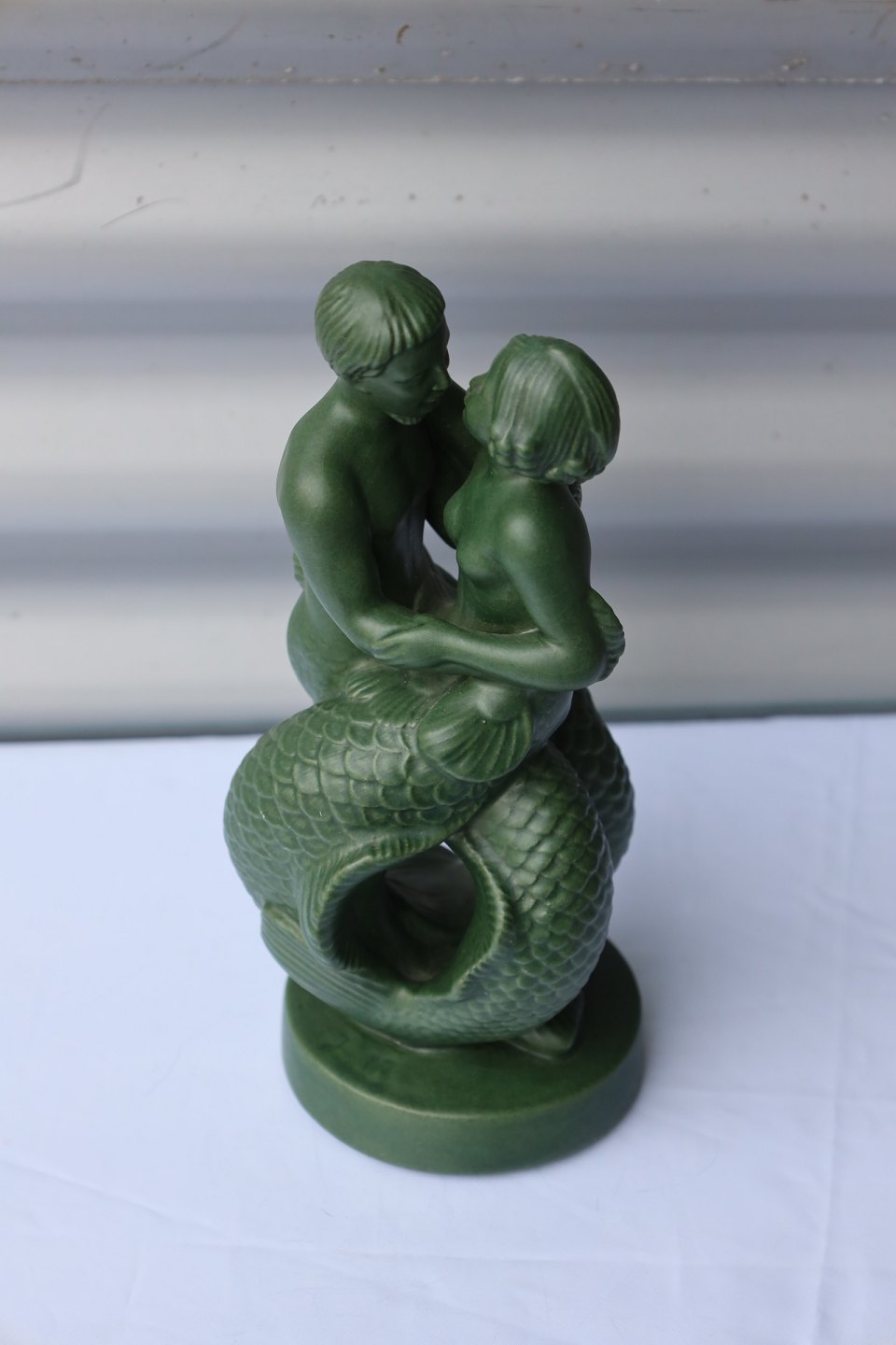 Ipsen Denmark nr. 927, IV. Keramik figur "Havmand & havfruen". Figuren er helt grønglaseret.