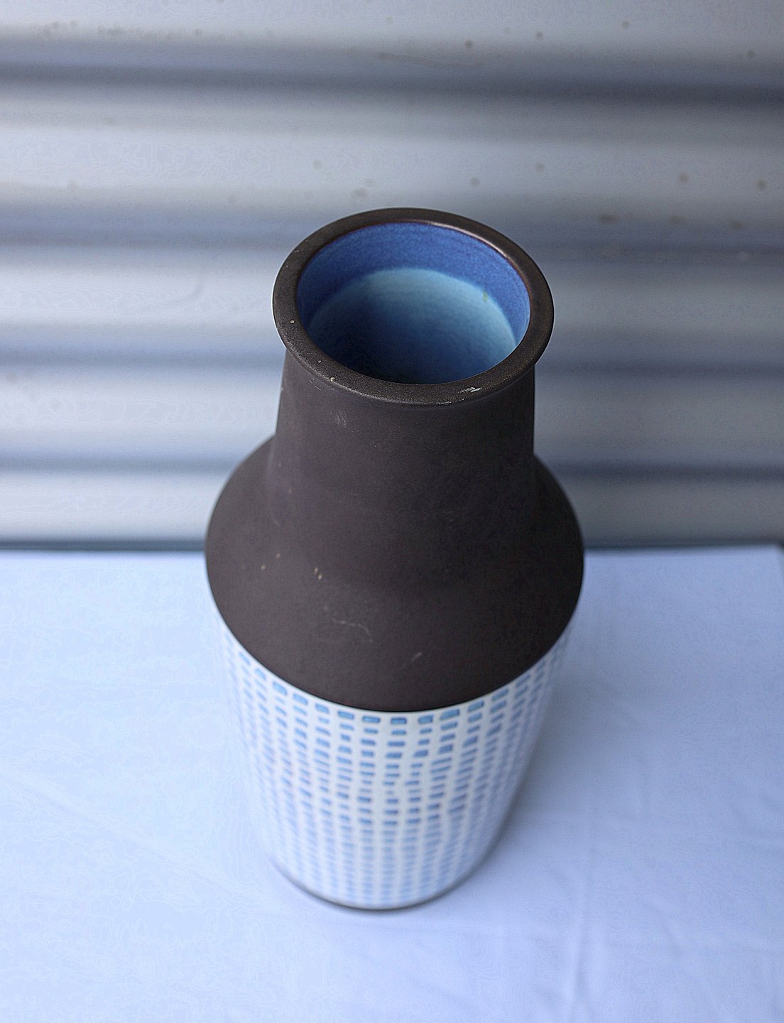 Aluminia vase nr. 3241."Thule"- vase i brunt keramik, på midten er der et geometrisk mønster i lyseblåt og hvidt. Vasen er glaseret blå indvendig.