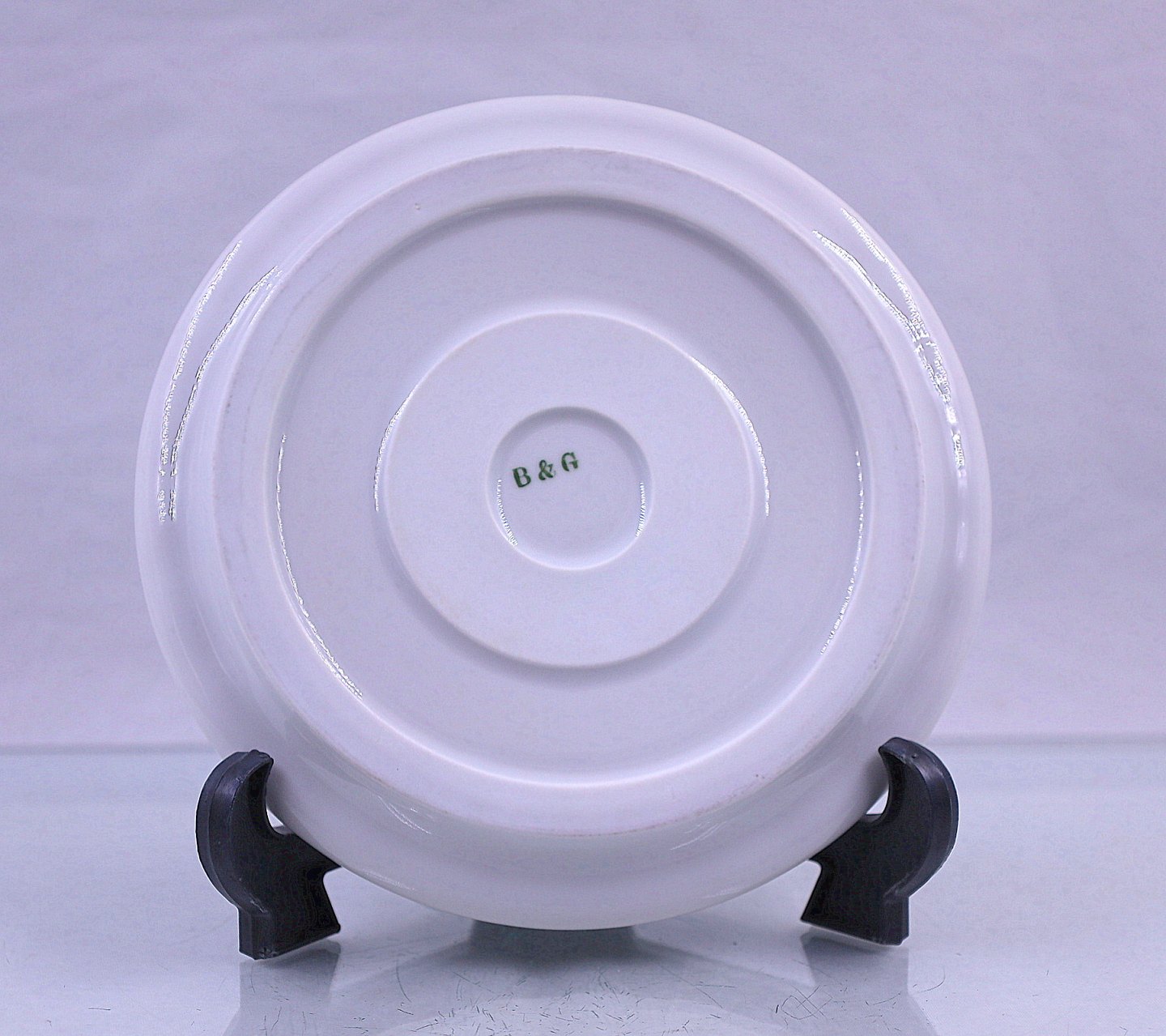 Fadet er dekoreret med et stiliseret egetræ i midten. Fadet er stemplet B&G.