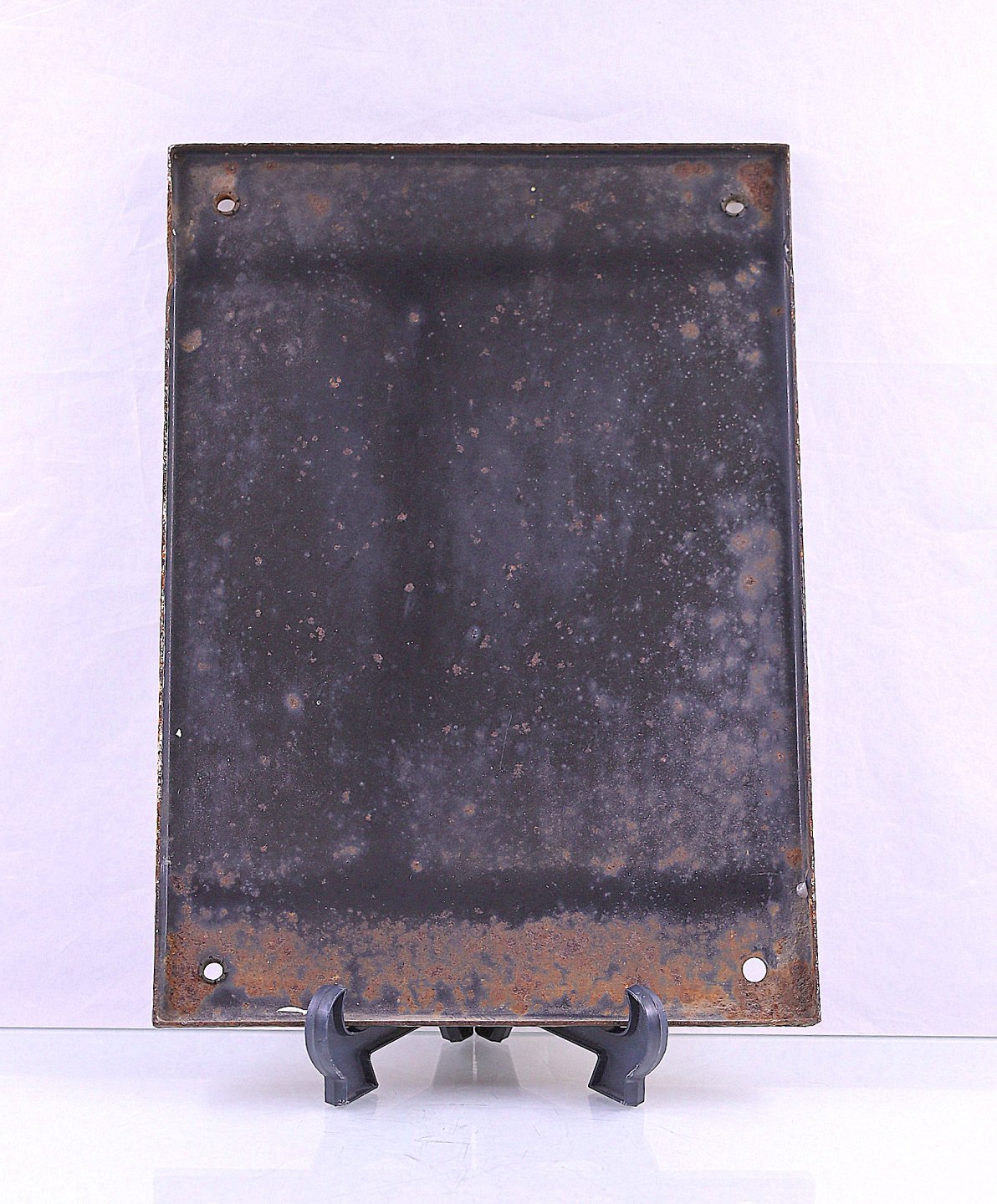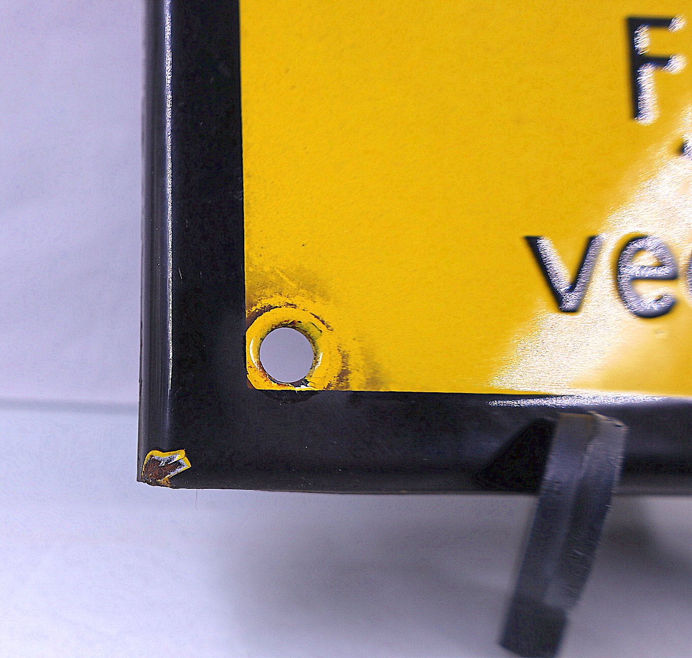 Emaljeskilt med advarsel, Trykflasker fjernes ved brand. Skiltet er gult, med sort trekant og sort tekst.