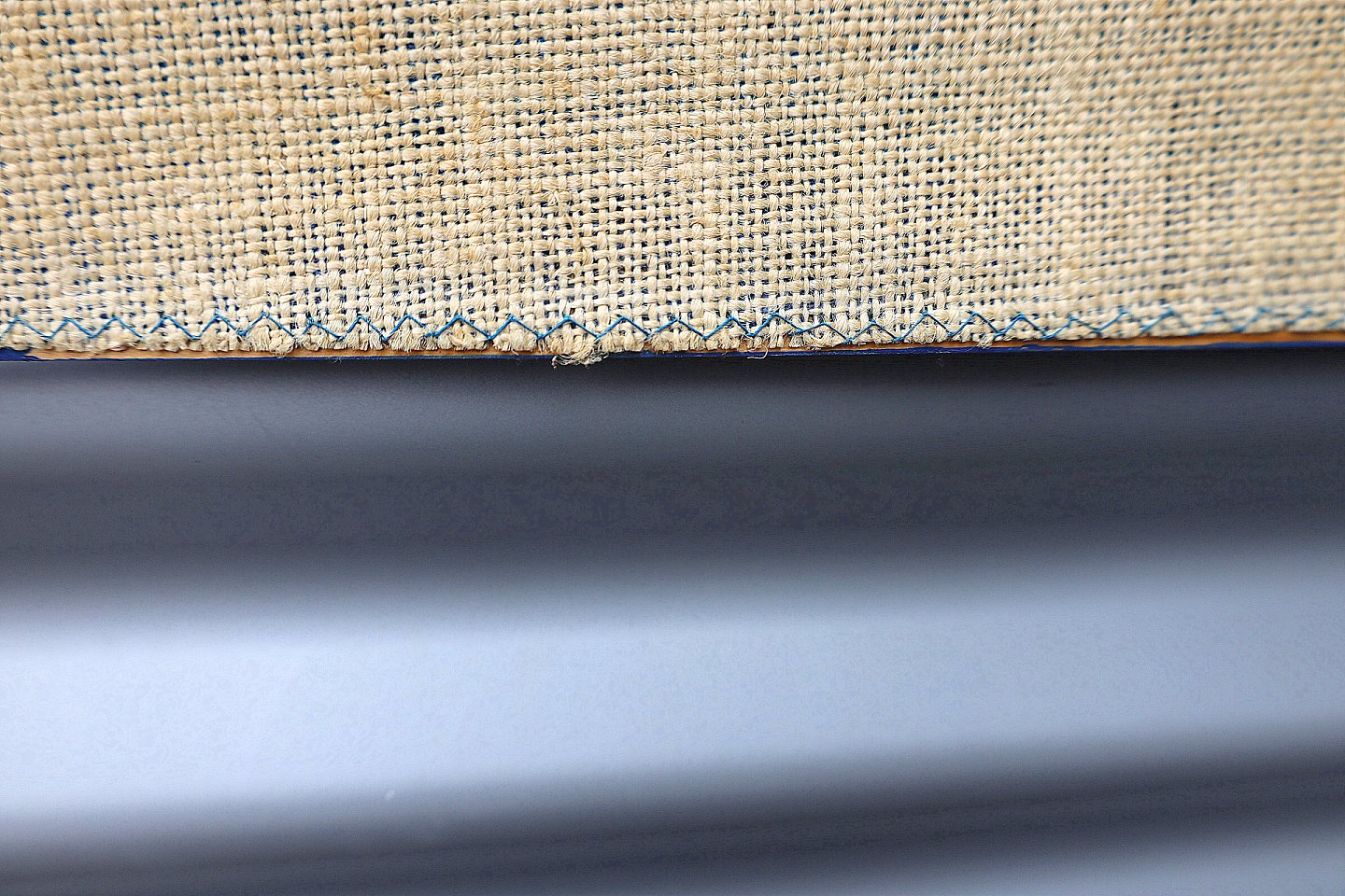 Væg ophæng, pige med muffedise og på skøjter. Ophæng trykt på sækkelærred, syet, med siksak sting, på ophængspinde, gummiophænget er sømmet på pinden.