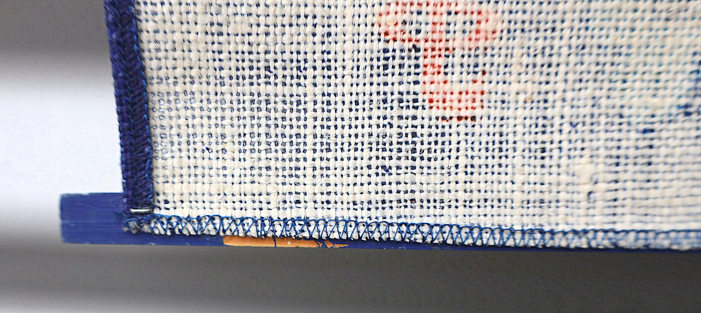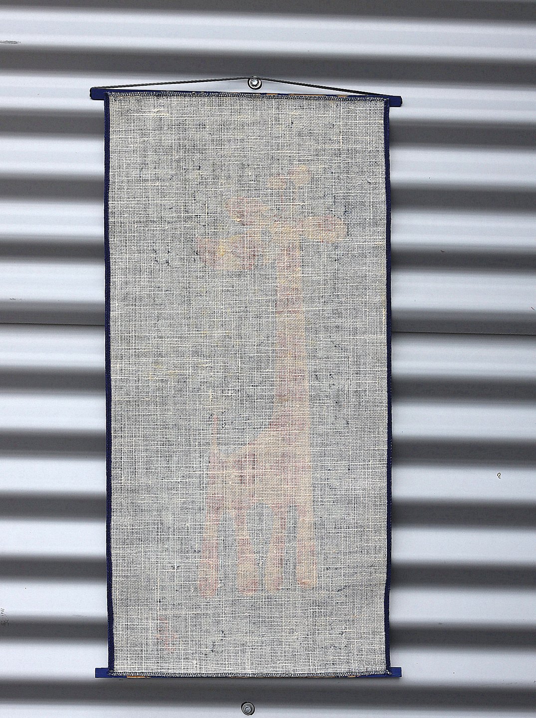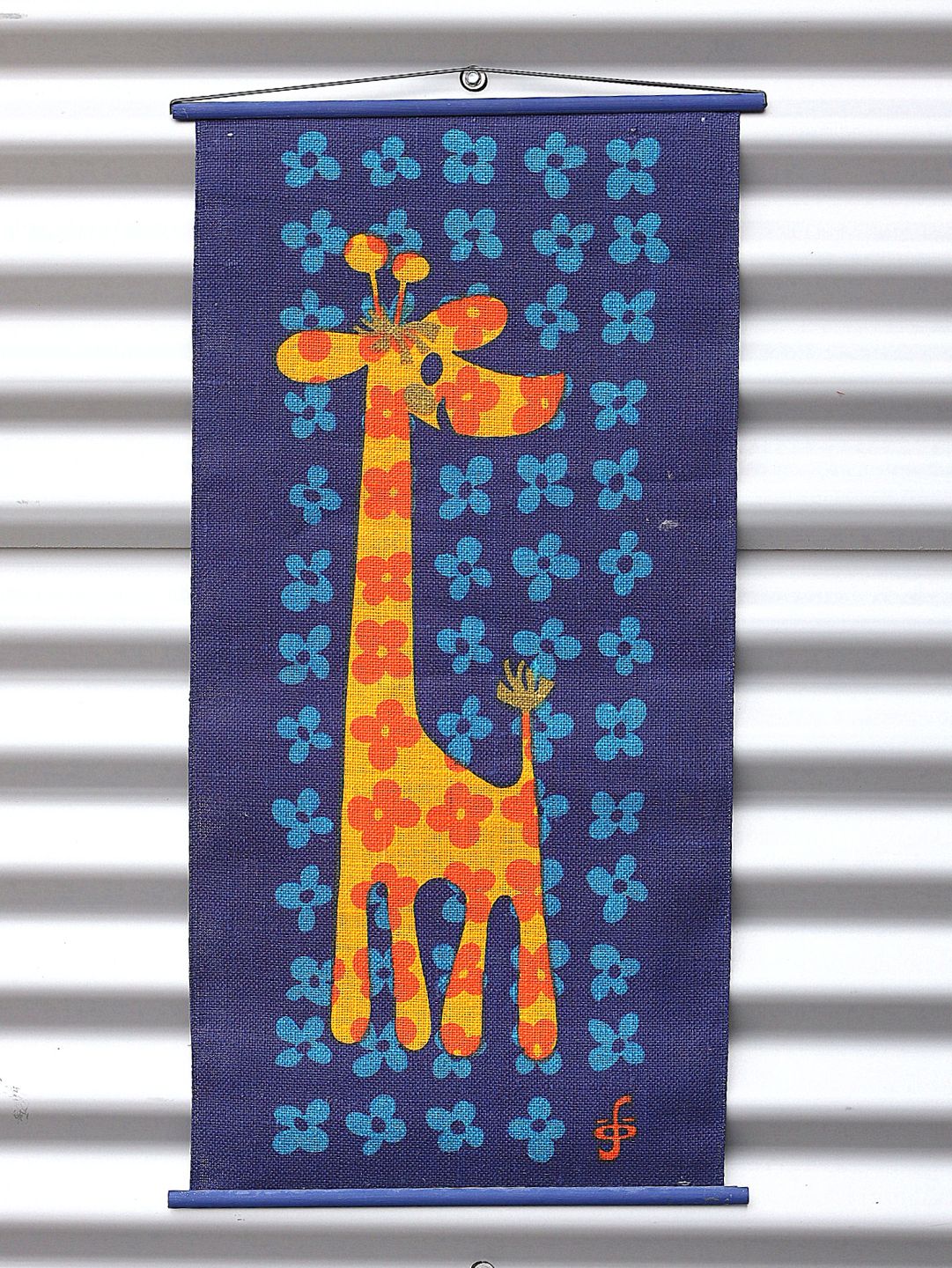 Væg ophæng, blåt ophæng med lyse blomster og gul giraf med orange blomster. Ophæng trykt på sækkelærred, syet, med siksak sting, på ophængspinde, gummiophænget er sømmet på pinden.