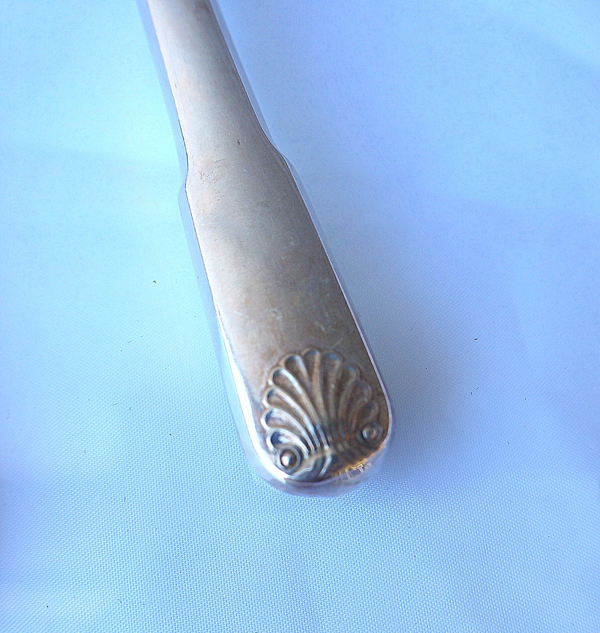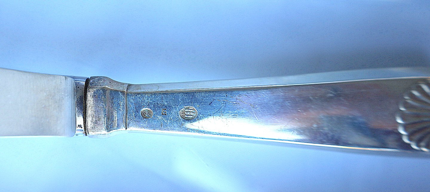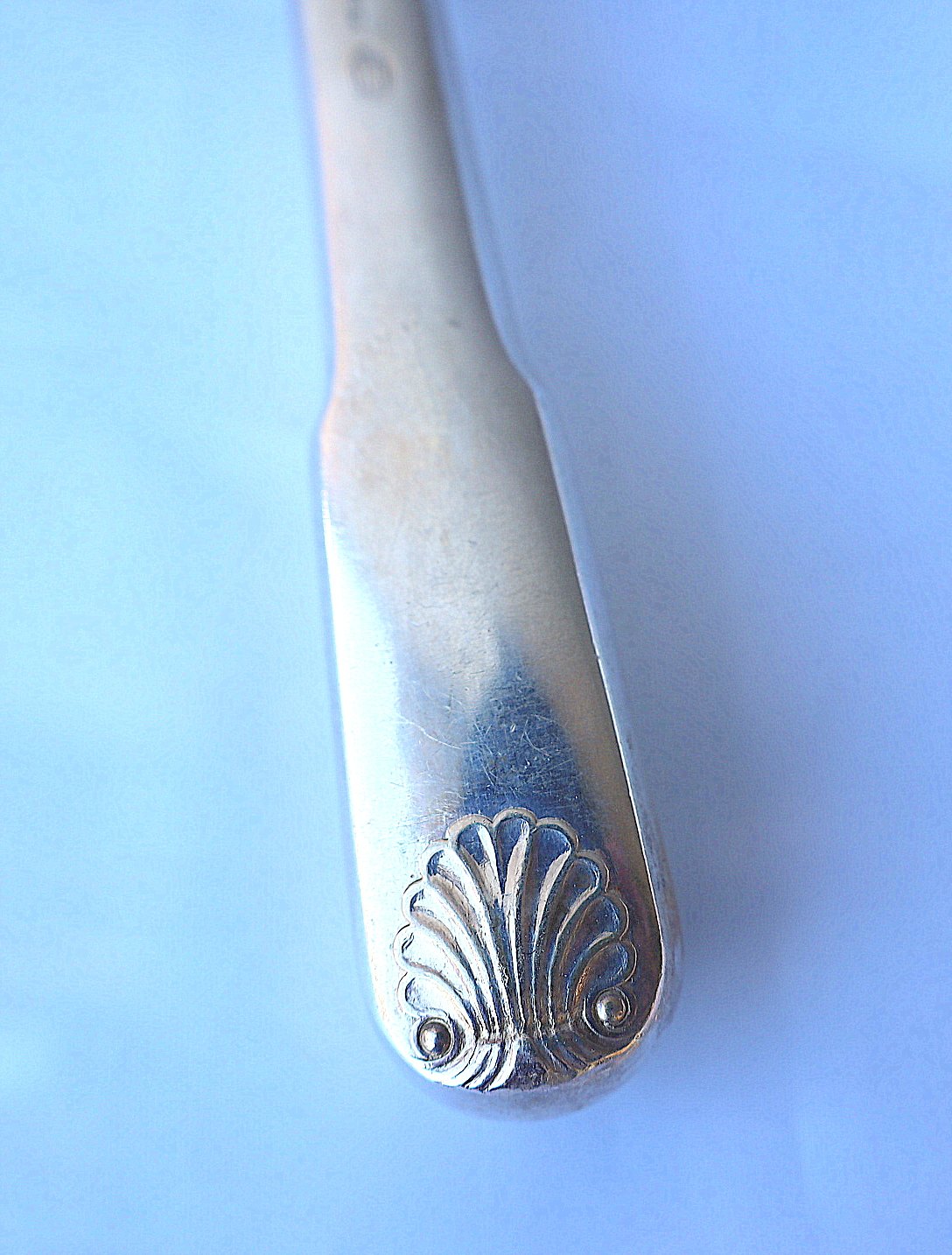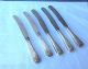 Sæt med fem middagsknive i sølv med muslingemotiv