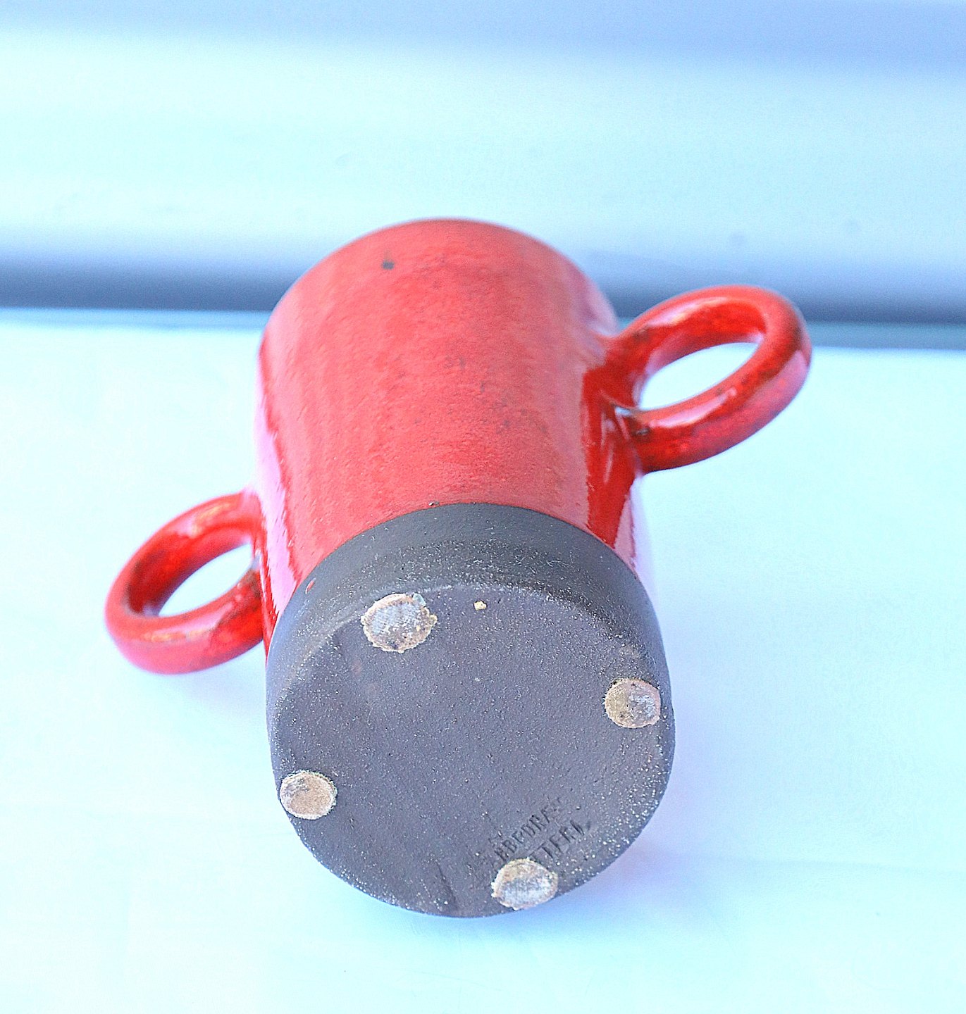 Abbednæs Potteri, krus med 2 runde hanke. Keramik, rød glaseret, krus med 2 røde hanke.