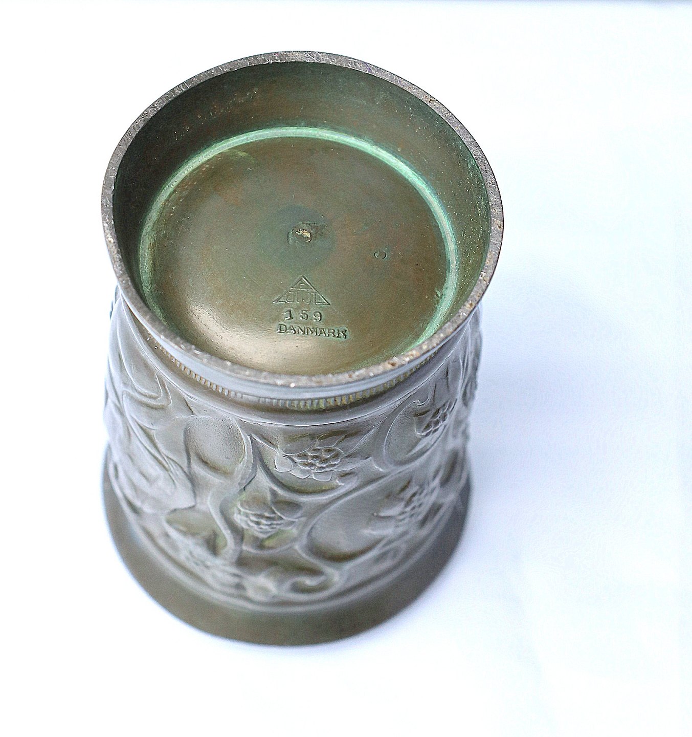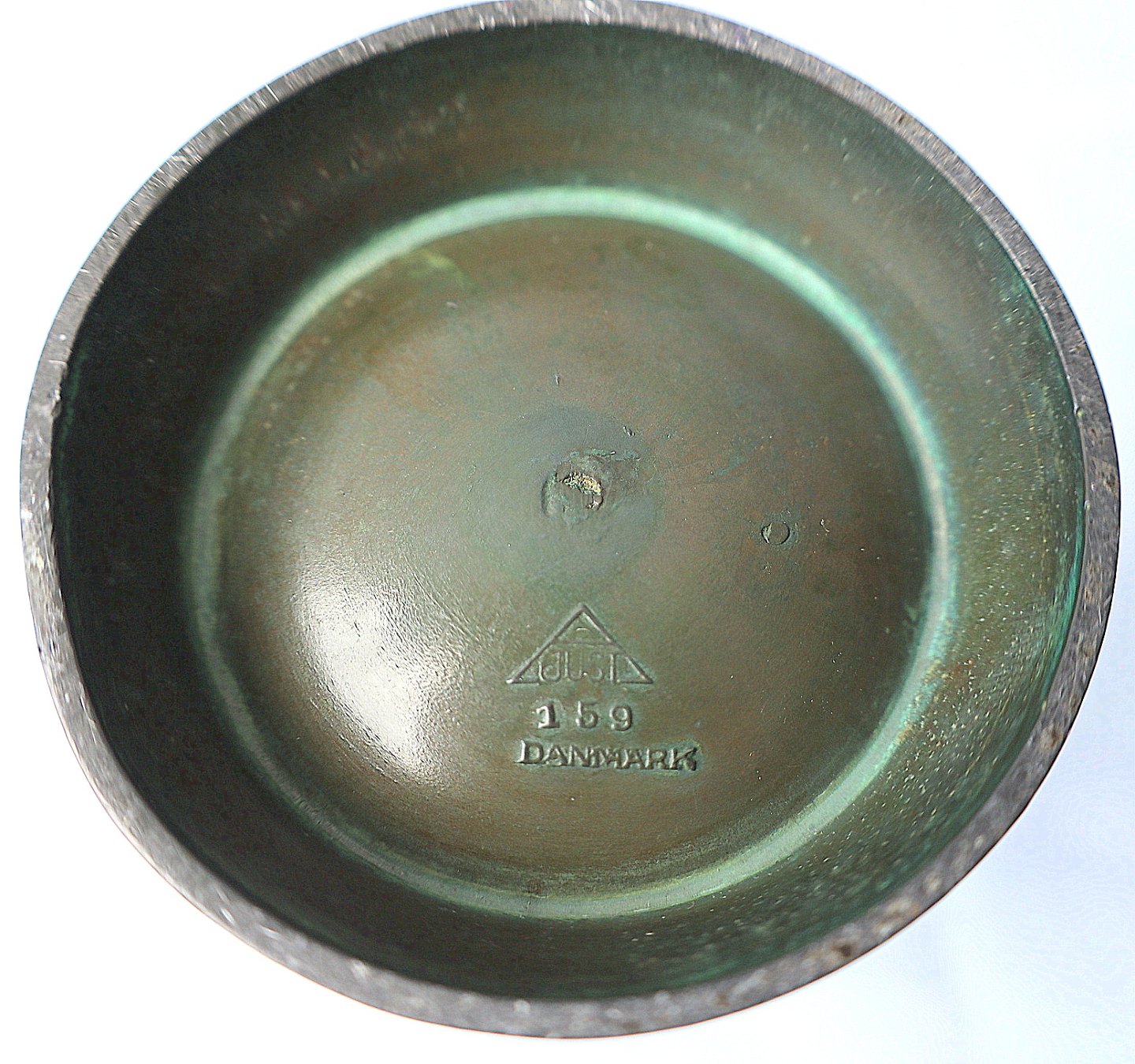 Just Andersen. Disko metal vase, nr. 159. Vasen er dekoreret med 2 figurscenerier. Mand der er en løve, og mand og kvinde, samt bær.