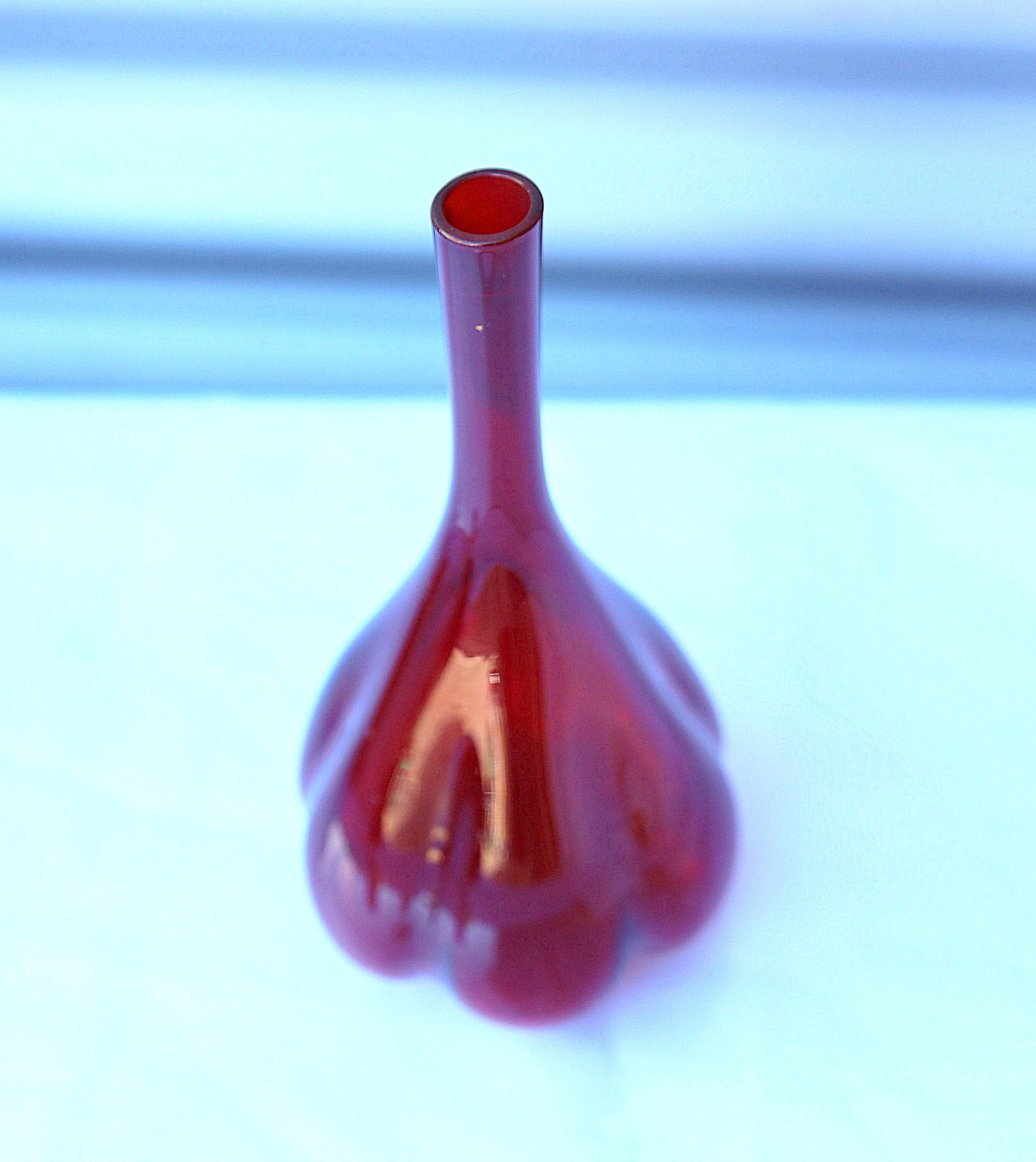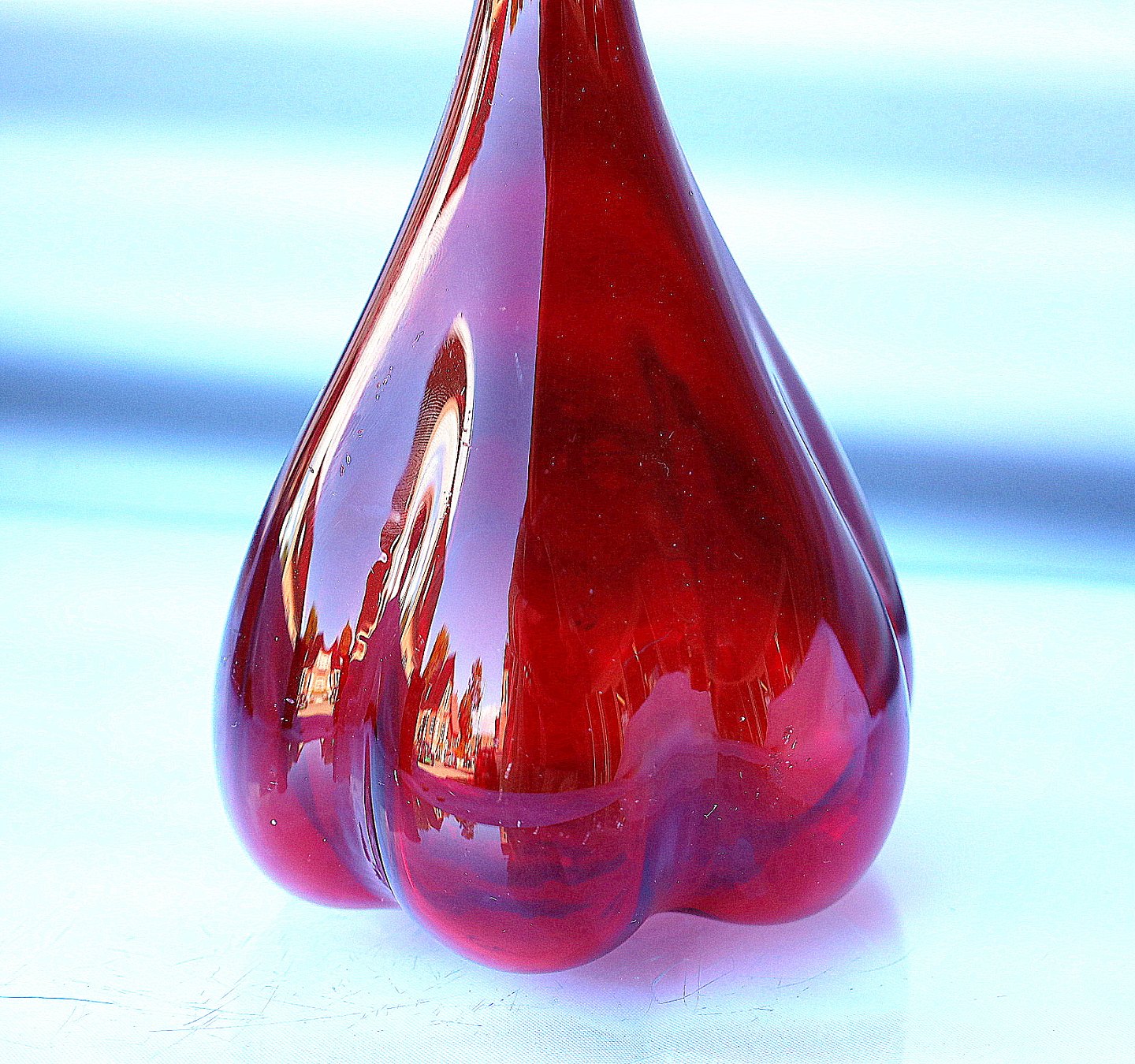 Rød vase Dyb rød, løg formet glasvase, med lang hals.