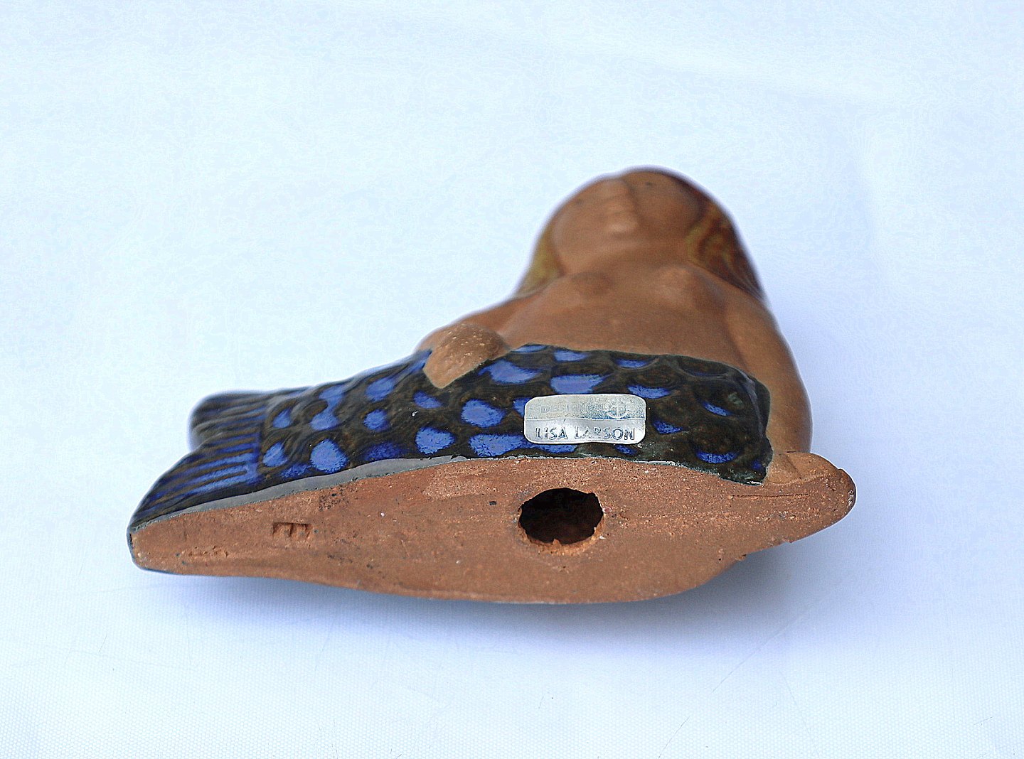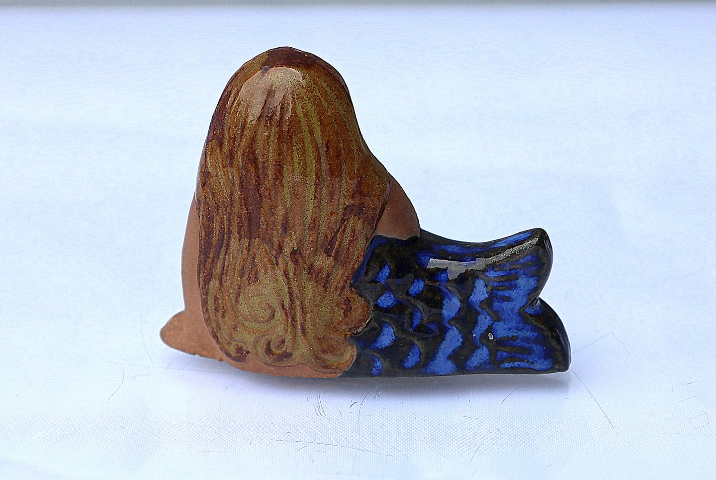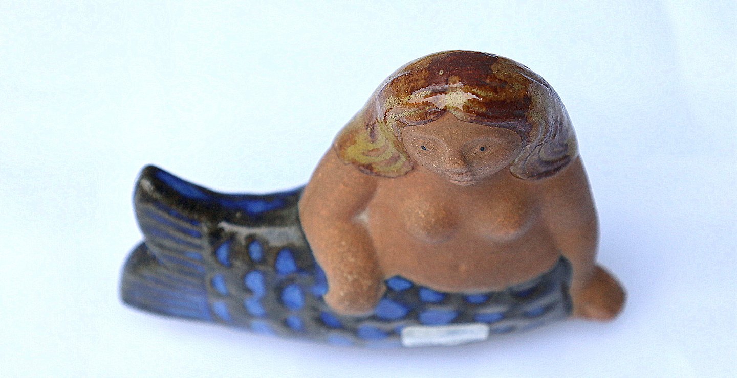 Lisa Larson, Gustavsberg. Keramik Havfrue. Havfruen har blå hale med lyseblå prikker, Havfruen har langt hår. Havfruen er fremstillet Gustavsberg, Sverige fra 1963.