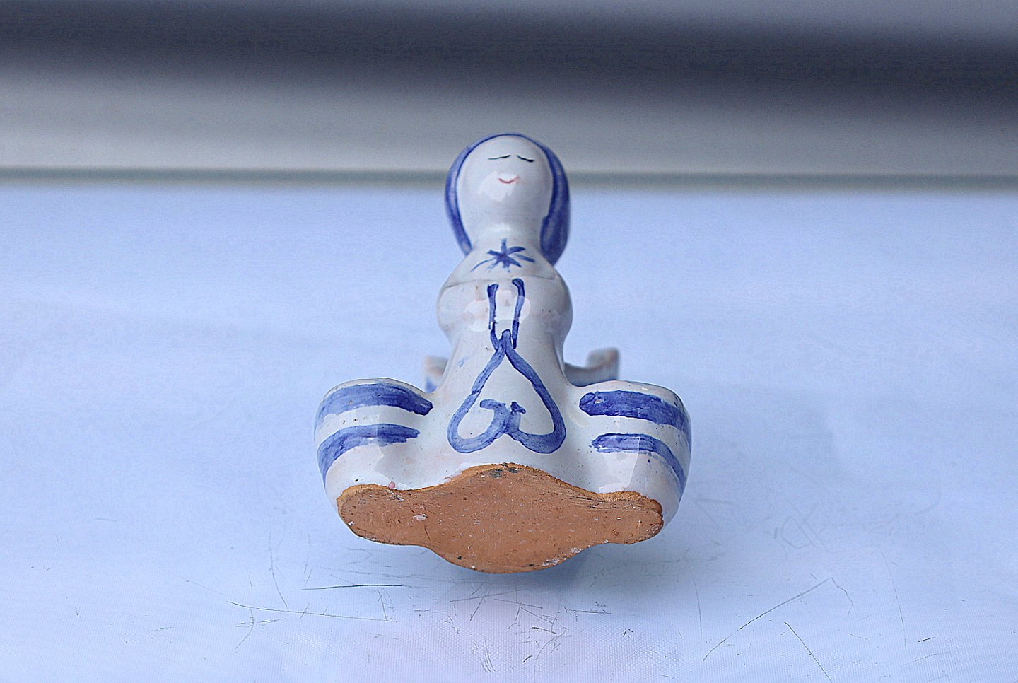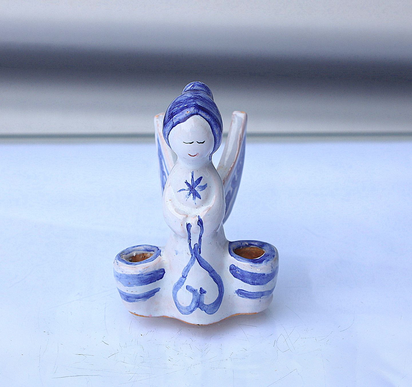 Keramik engel. Dameenglen er til 2 kertelys. Englen er holdt i blå og hvide farver. Dameenglen er håndmalet.