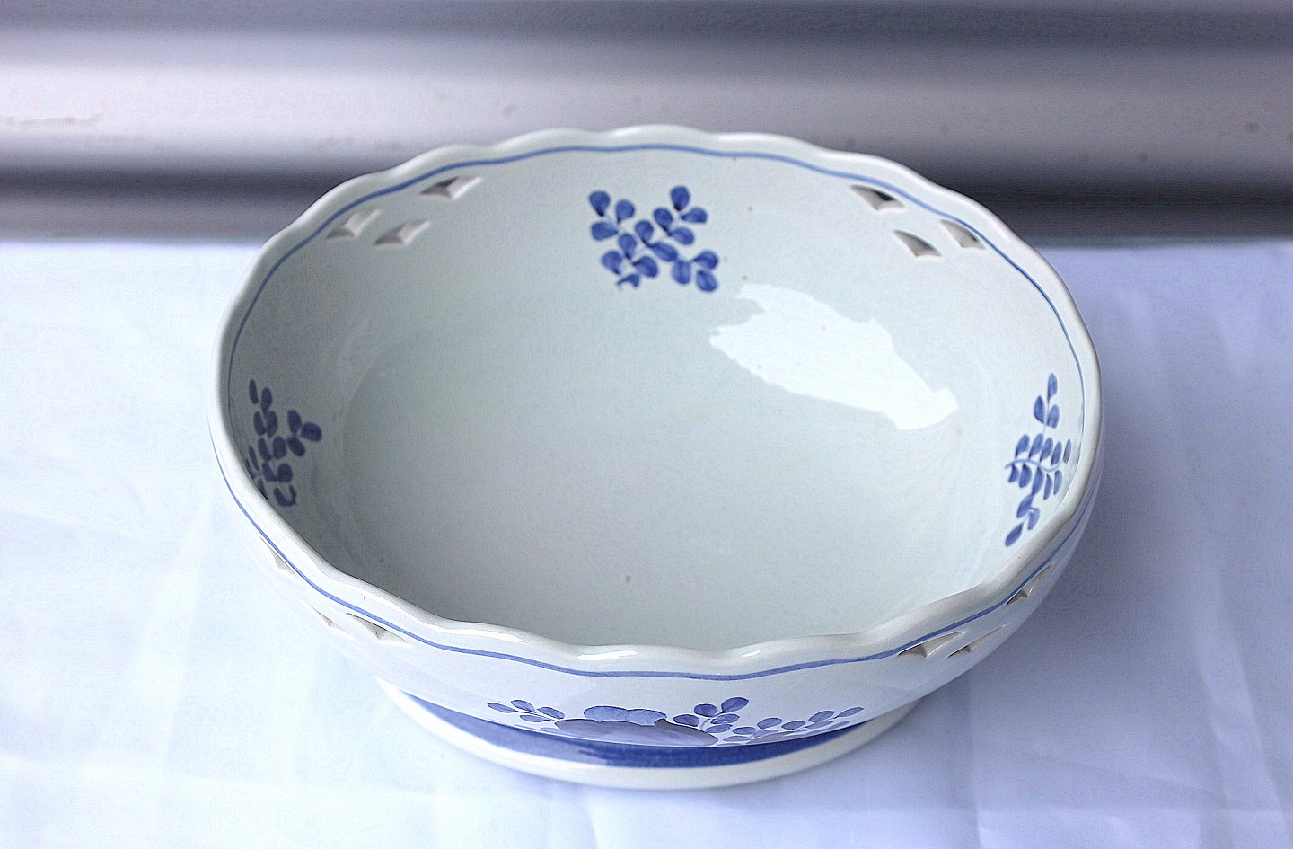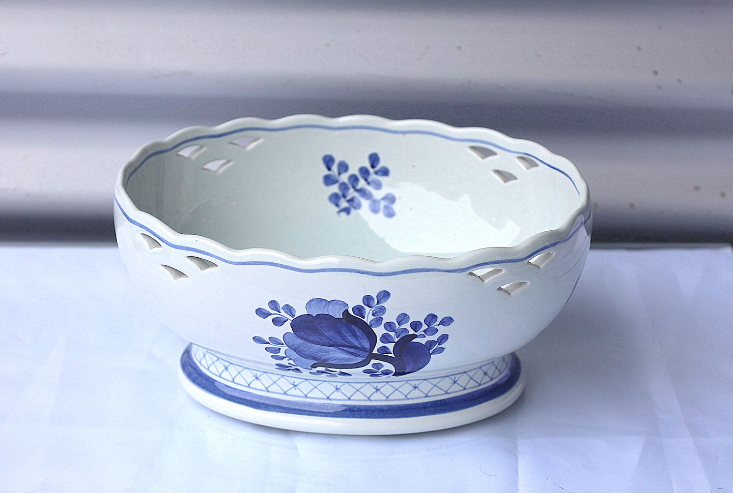 Aluminia Tranquebar, skål nr. 11/706. Oval skål, med blå dekoration og skålen er af fajance, på fod og gennembrudt kant