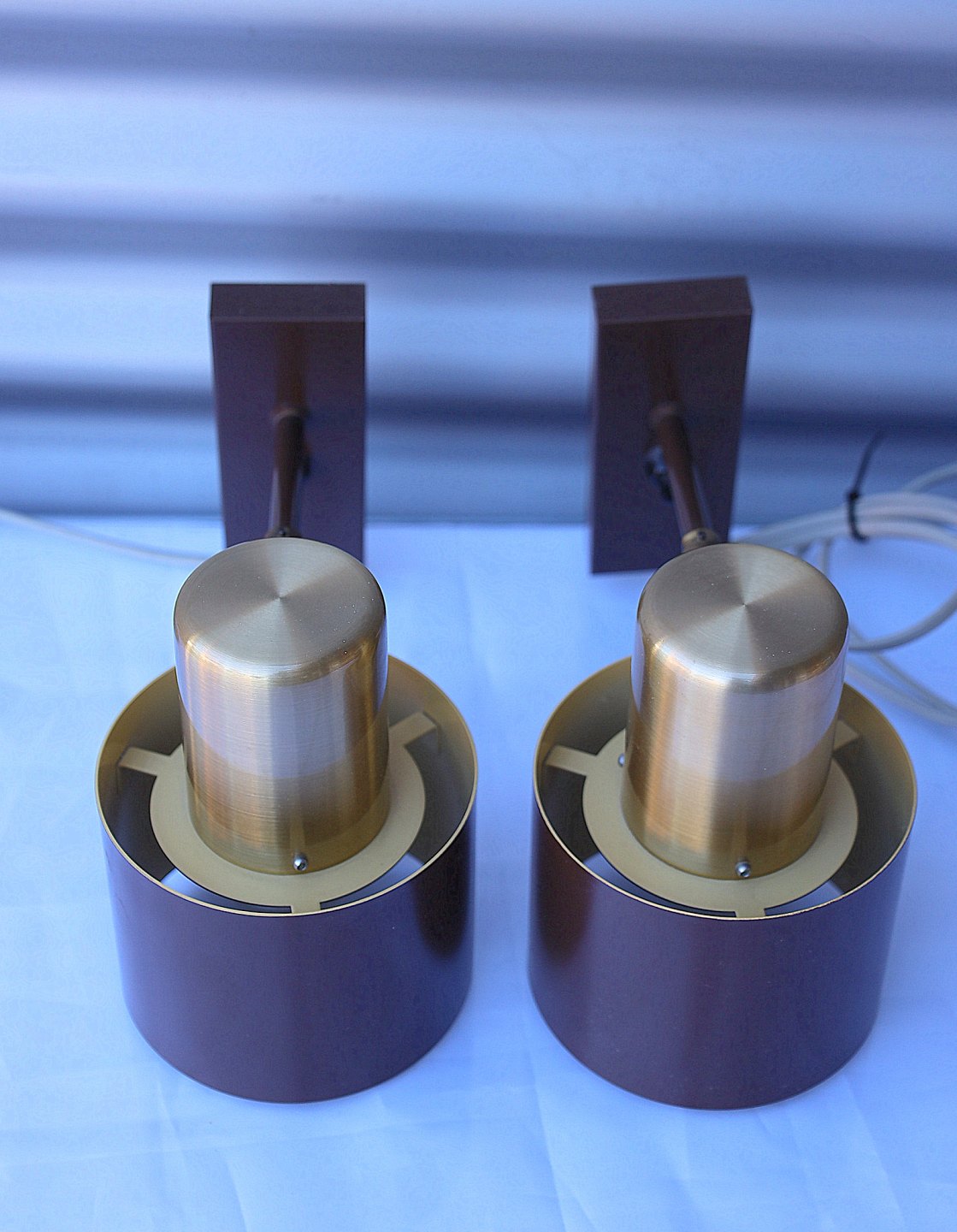 Modellen hedder Alfa og dette par er udført i mat brun lakering og messing. Indvendig gul lakering, der giver et dejligt lys.