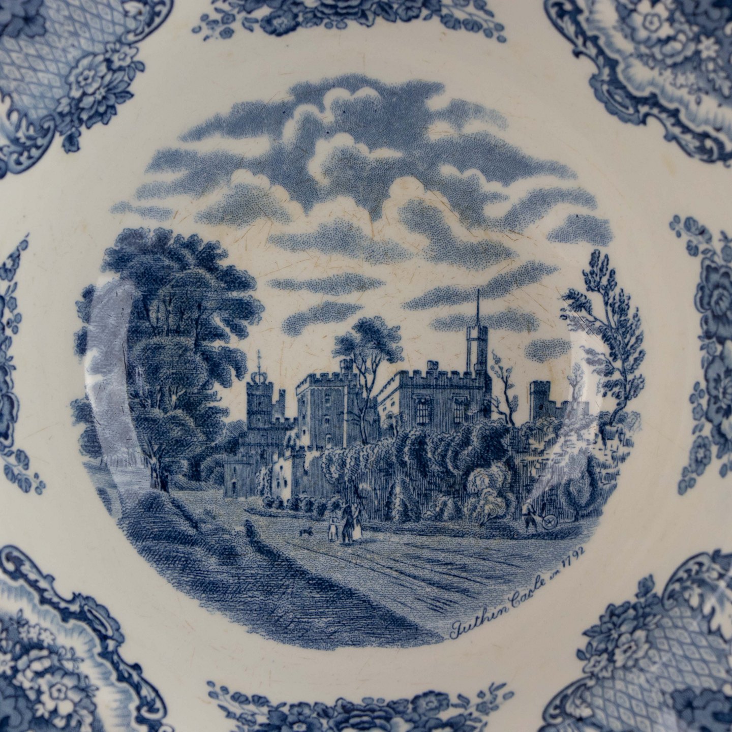 Skål i lys fajance med blådekoreret slotsmotiv.