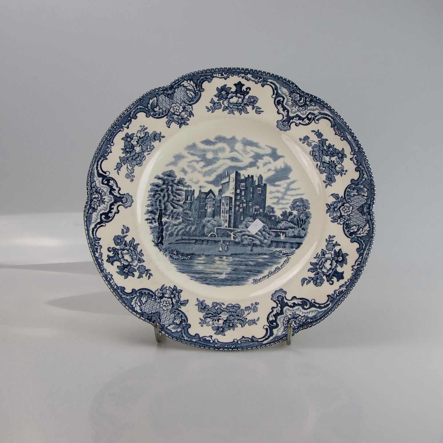 Tallerken i lys ironestone med blådekoreret slotsmotiv.