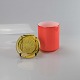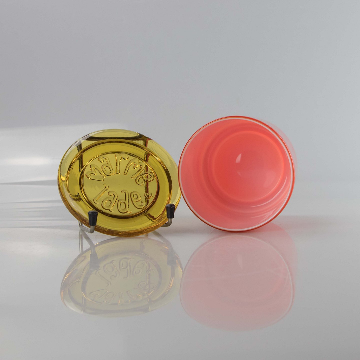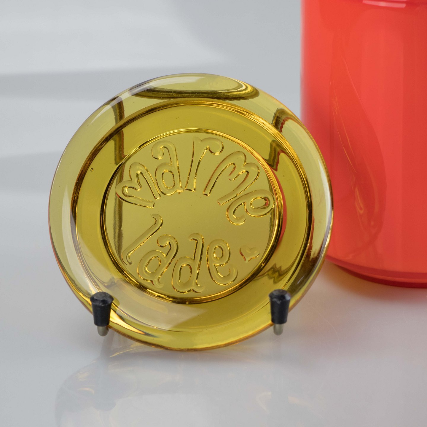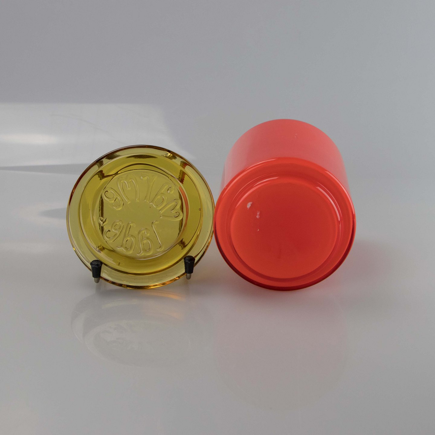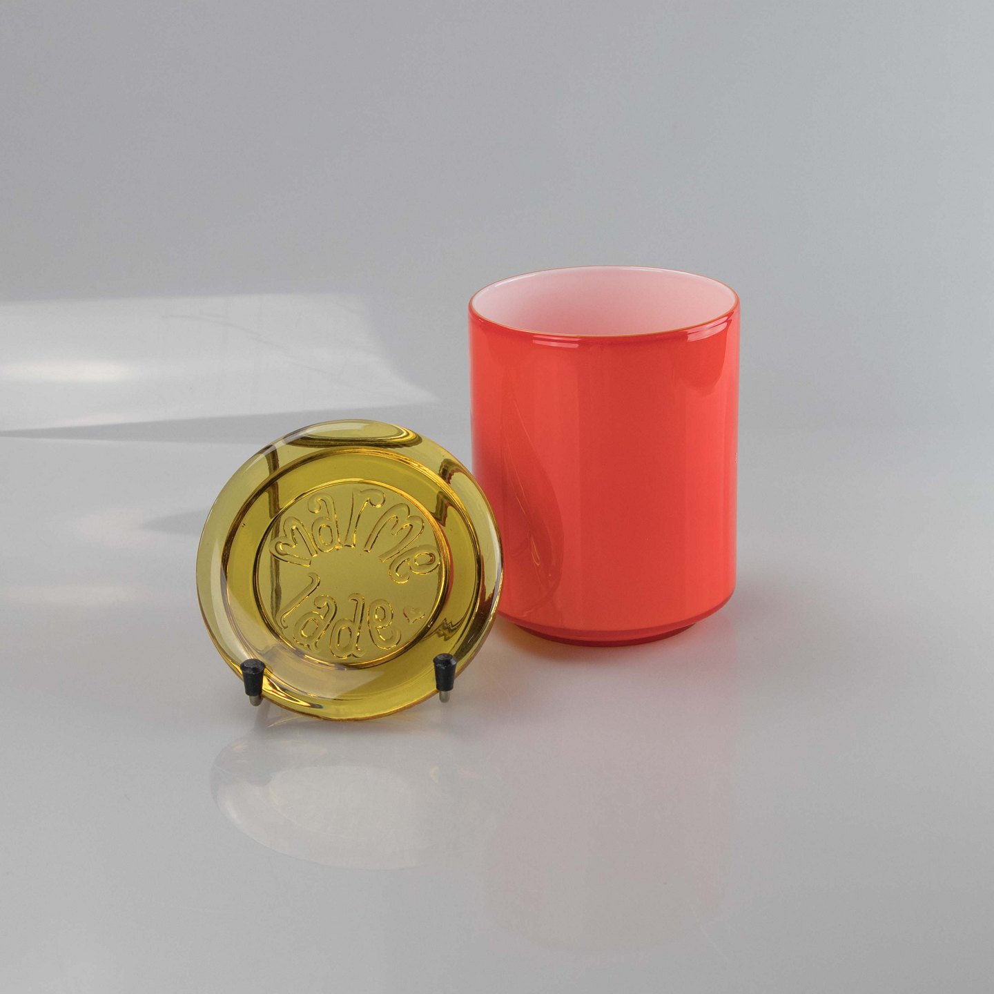 Krukke i orangerødt glas med opalhvid inderside og brungult låg i tykt glas.