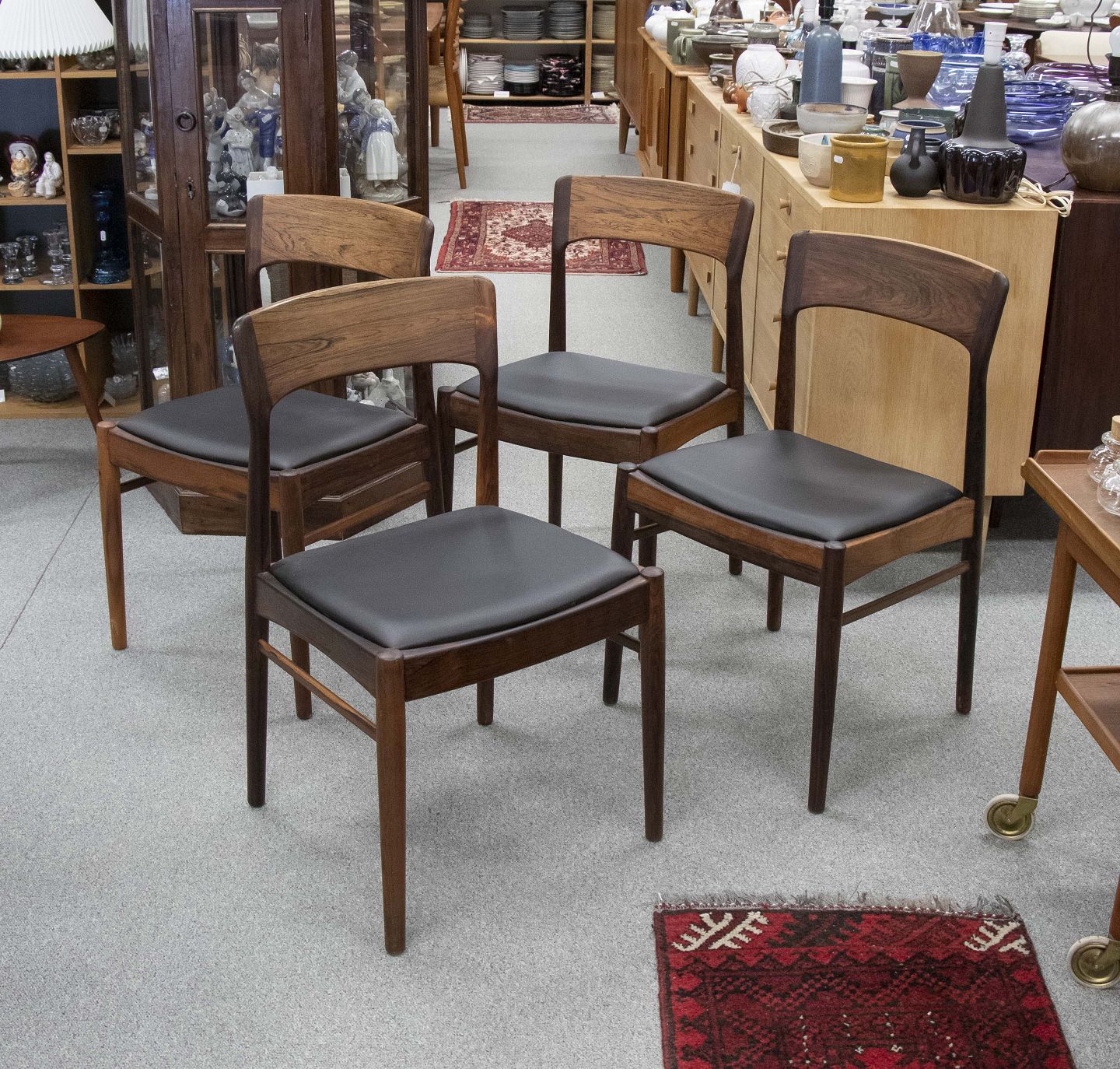 Et sæt med fire stole model 26 i teaktræ og palisander, nypolstret med sorte læder sæder.