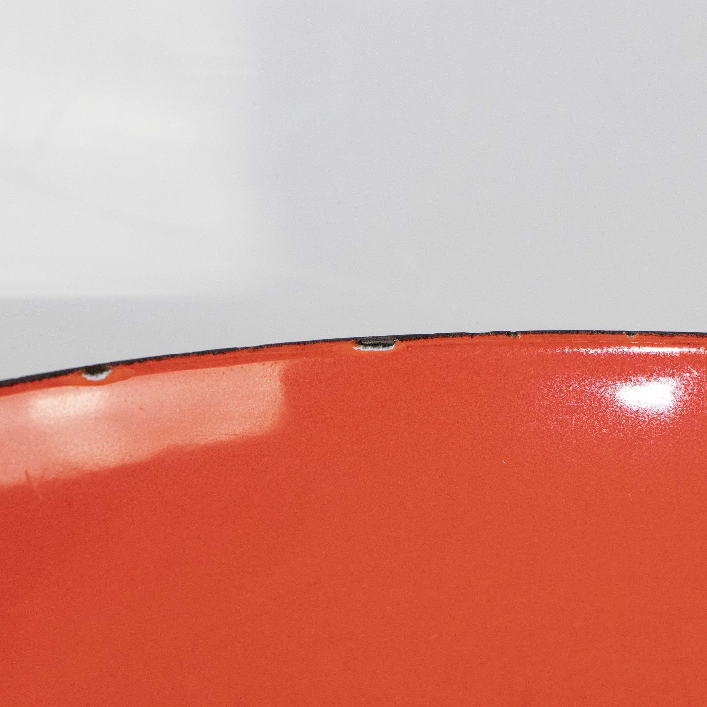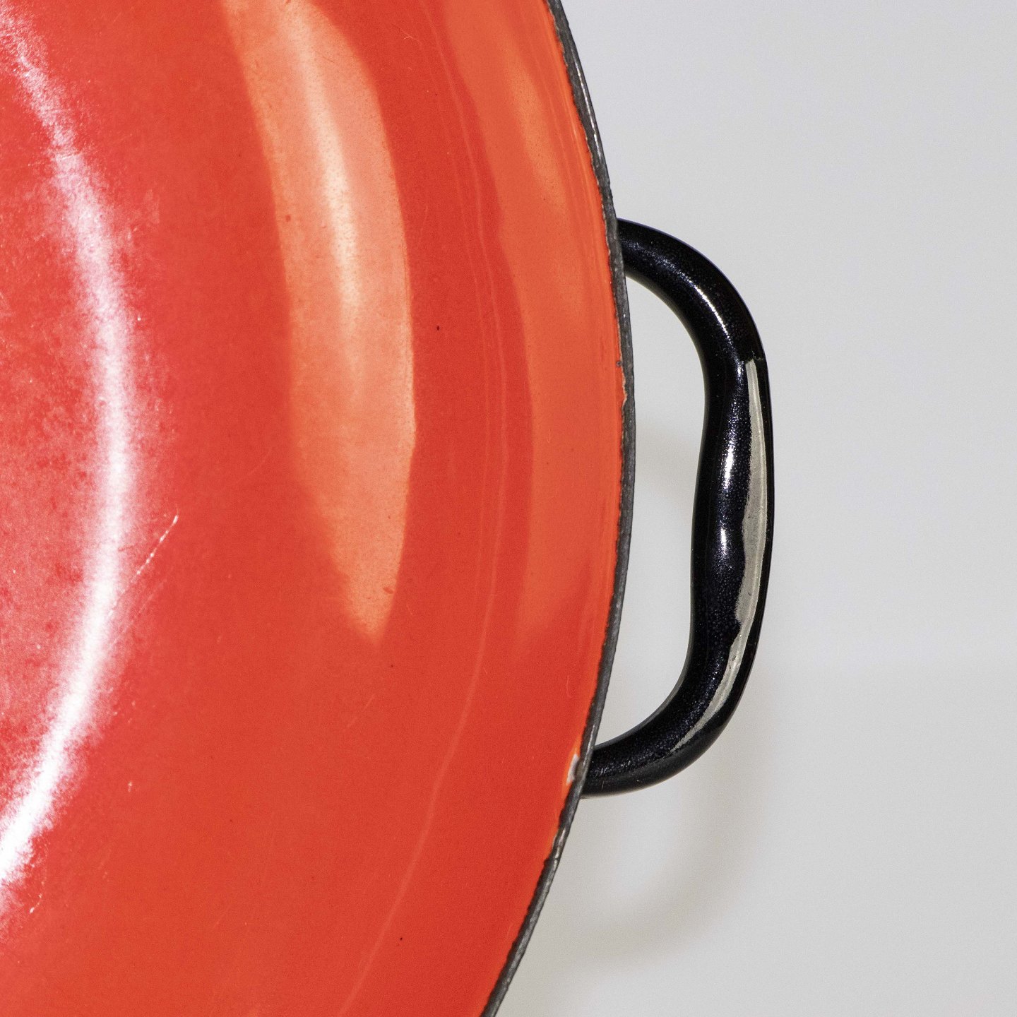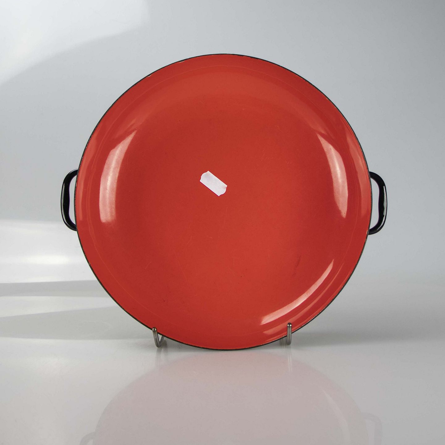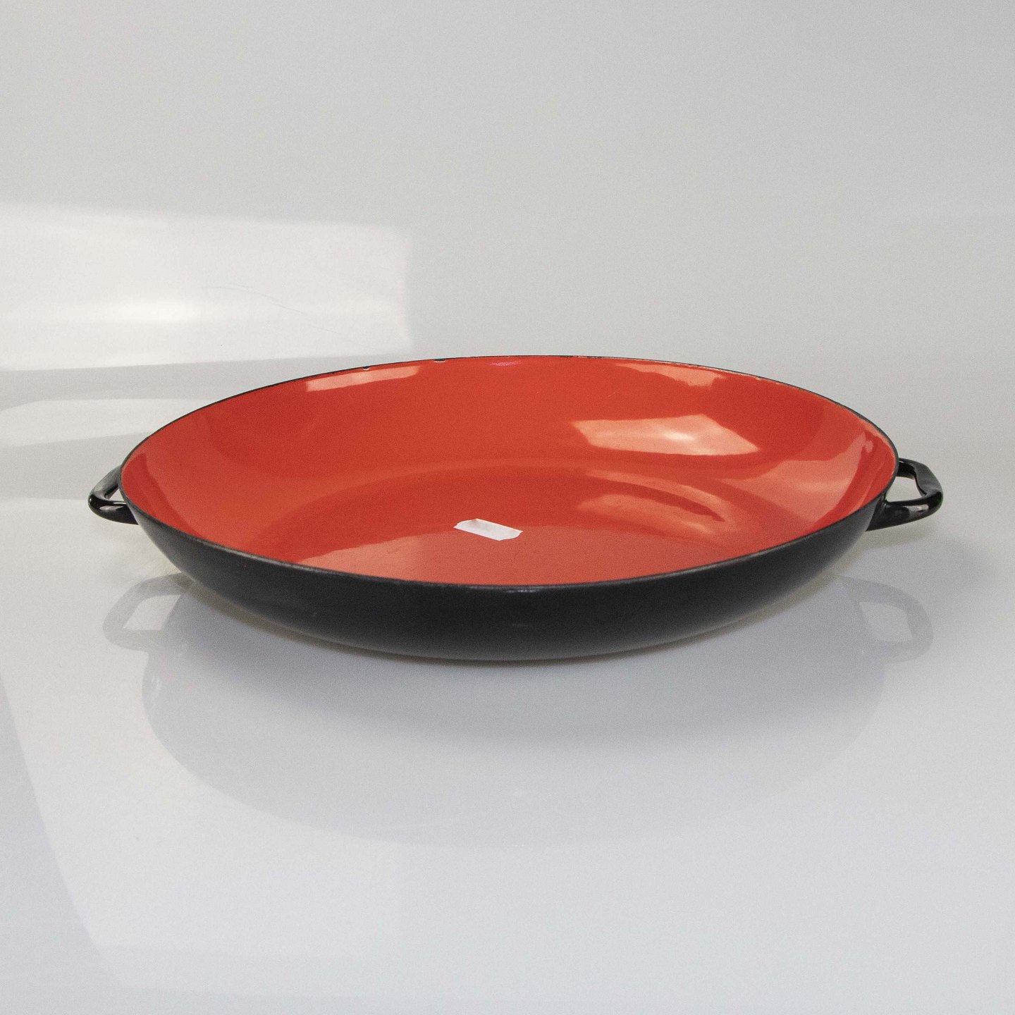 Krenit rødlig fad stor med hank, sort bagside