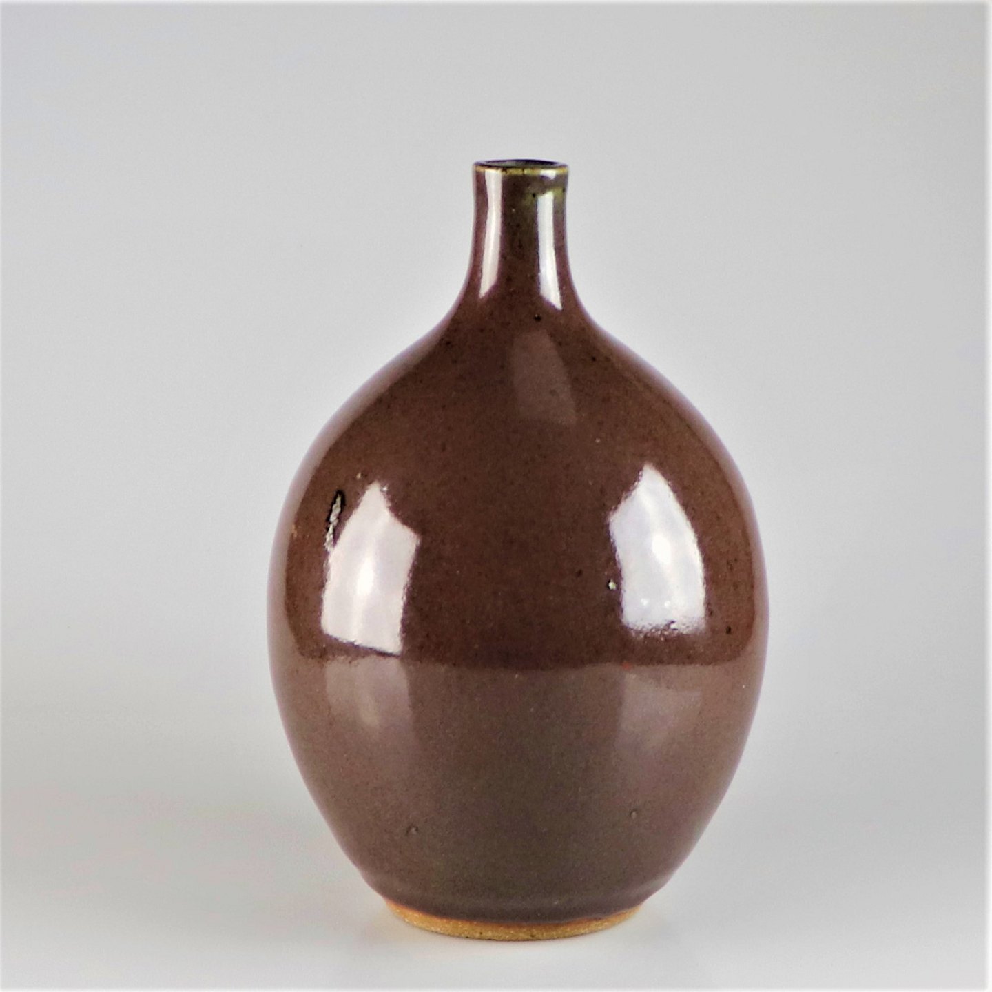 Brun vase, smal åbning, smal top, hvid og grøn i midten